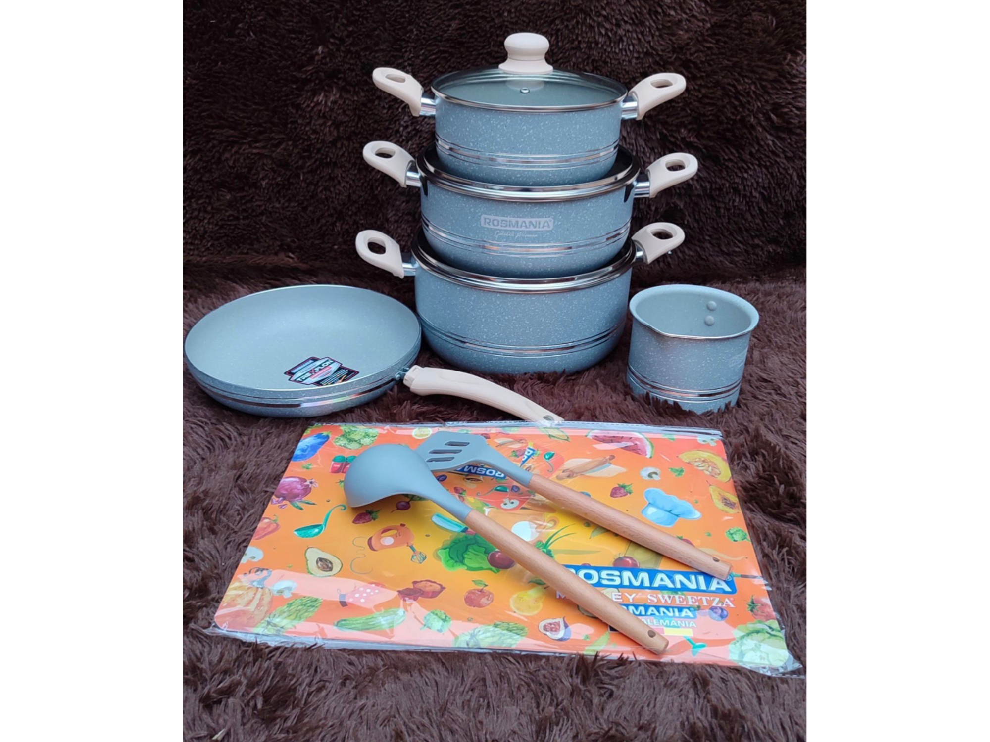 Set de ollas rosmania 9 piezas*Set de Ollas Rosmania (9 piezas)* ▪️Material: Aluminio con revestimiento de mármol antiadherente ▪️Capas: 10x con base de roca volcánica ▪️Incluye: tapas de vidrio, utensilios, posavasos y mantel ▪️Tecnología alemana Trexflon Premium$95.000 Observaciones 0 / 150