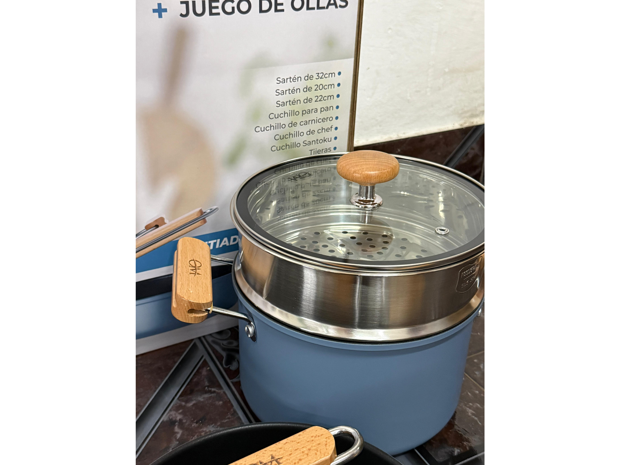 Set de cocina Om + cuchillos Compartir por WhatsApp Copiar enlace *Set de cocina OM + cuchillos* ▪️Revestimiento antiadherente: cocción sin que se pegue ▪️Diseño moderno en color verde con detalles en madera ▪️Incluye ollas, sartén y juego de cuchillos ▪️Tapas de vidrio con salida de vapor ▪️Mangos ergonómicos: cómodos y seguros ▪️Ideal para uso diario y todo tipo de comidas ▪️Fácil limpieza y alta durabilidad$90.000 Observaciones 0 / 150