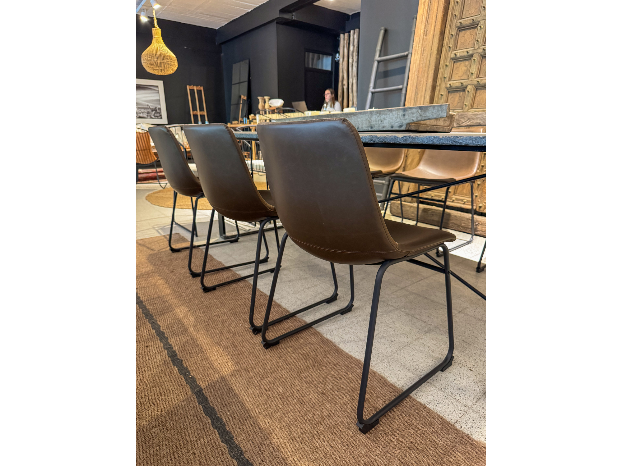 Disponible en tapizado de ecocuero marrón.