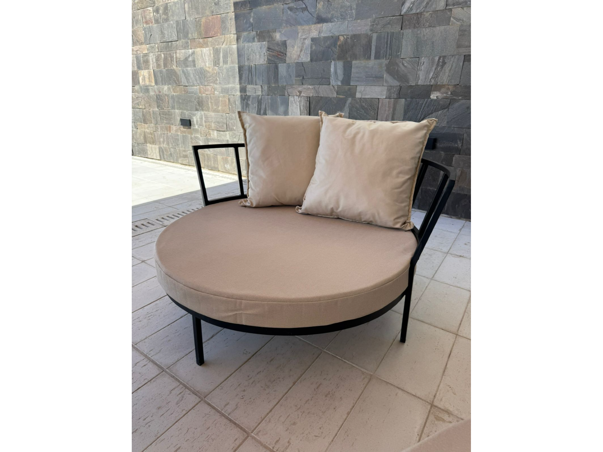 S: 70cm de diámetro- respaldo de 40cm de altura- 26cm de altura el asiento s/almohadón. Precio incluye almohadón de asiento + 2 almohadones de respaldo 60cm x 60cm en tela bull