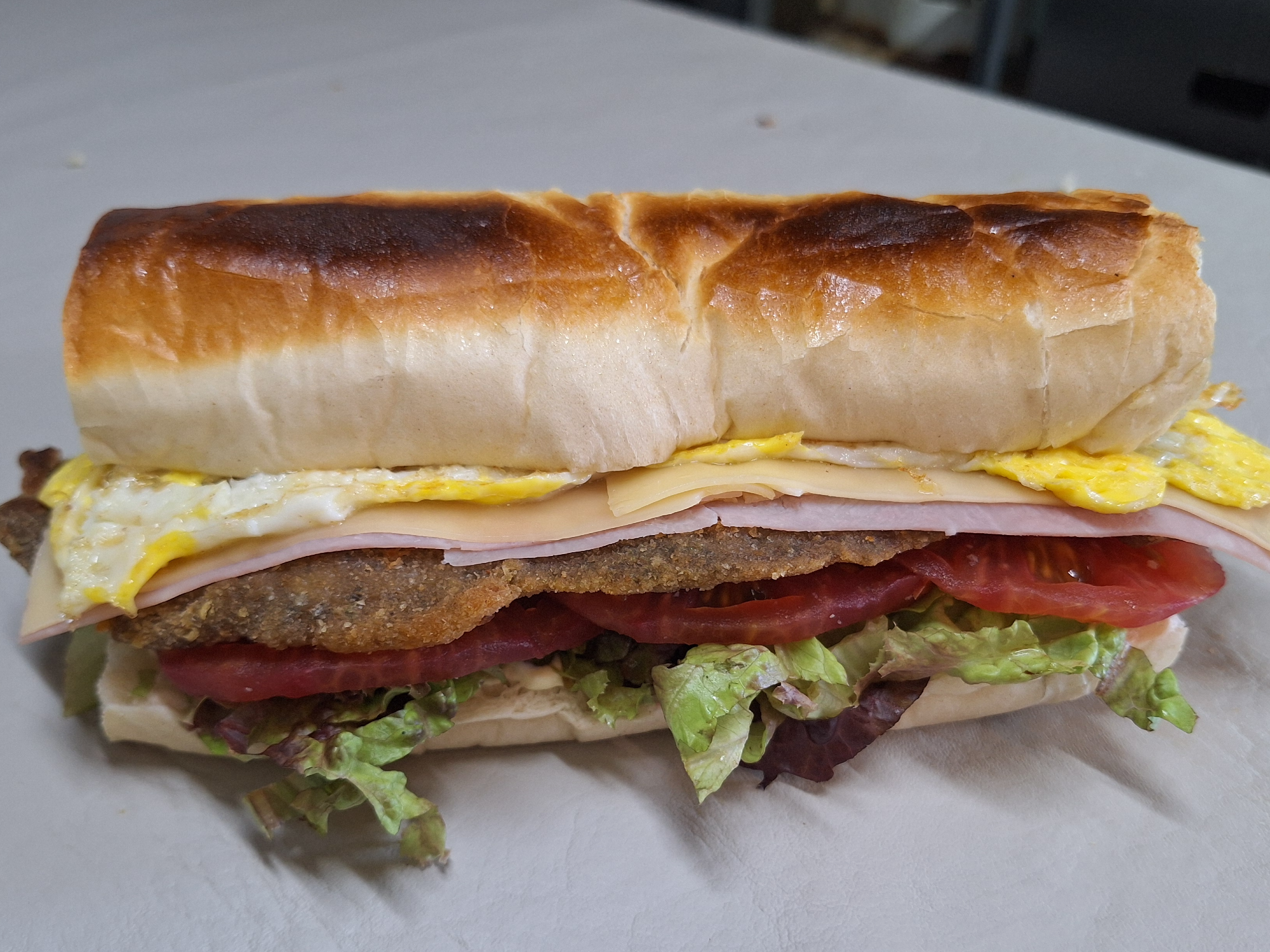 Mila Especial + Frita Compartir por WhatsApp Copiar enlace Pan Baguet 18cm- Milanesa-Mayo Cacera - lechuga- Tomate- Jamon cocido- Queso- Huevo + (porción de frita)$6.000 Observaciones 0 / 150