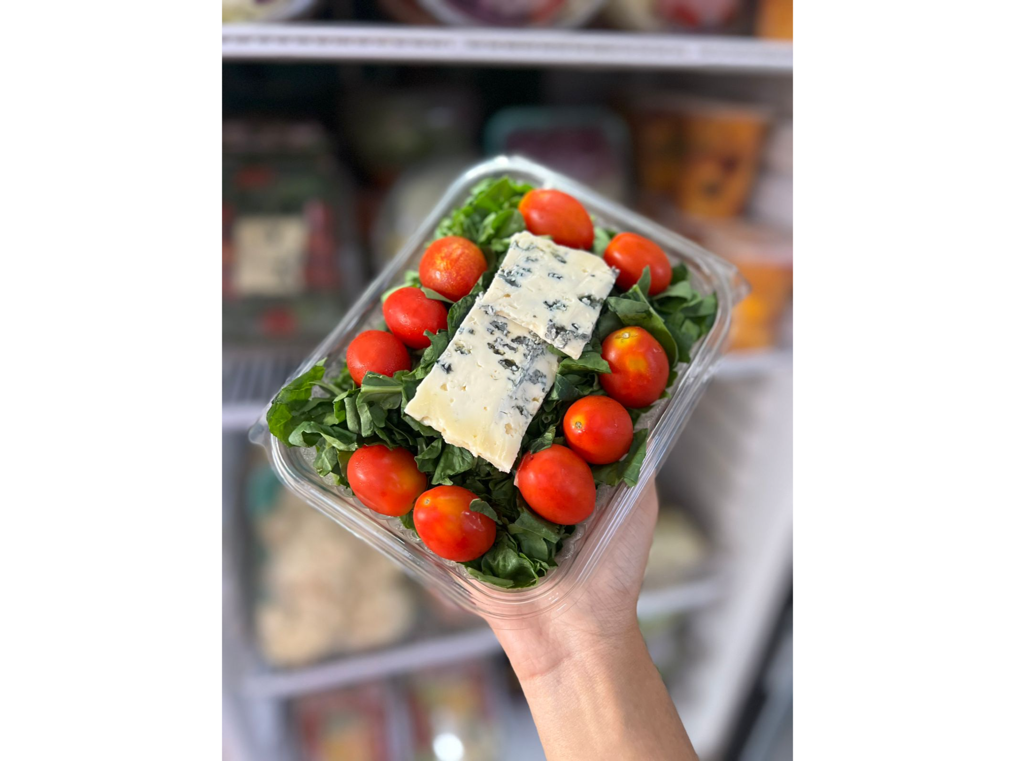 Contiene queso roquefort, tomate cherry y espinaca.