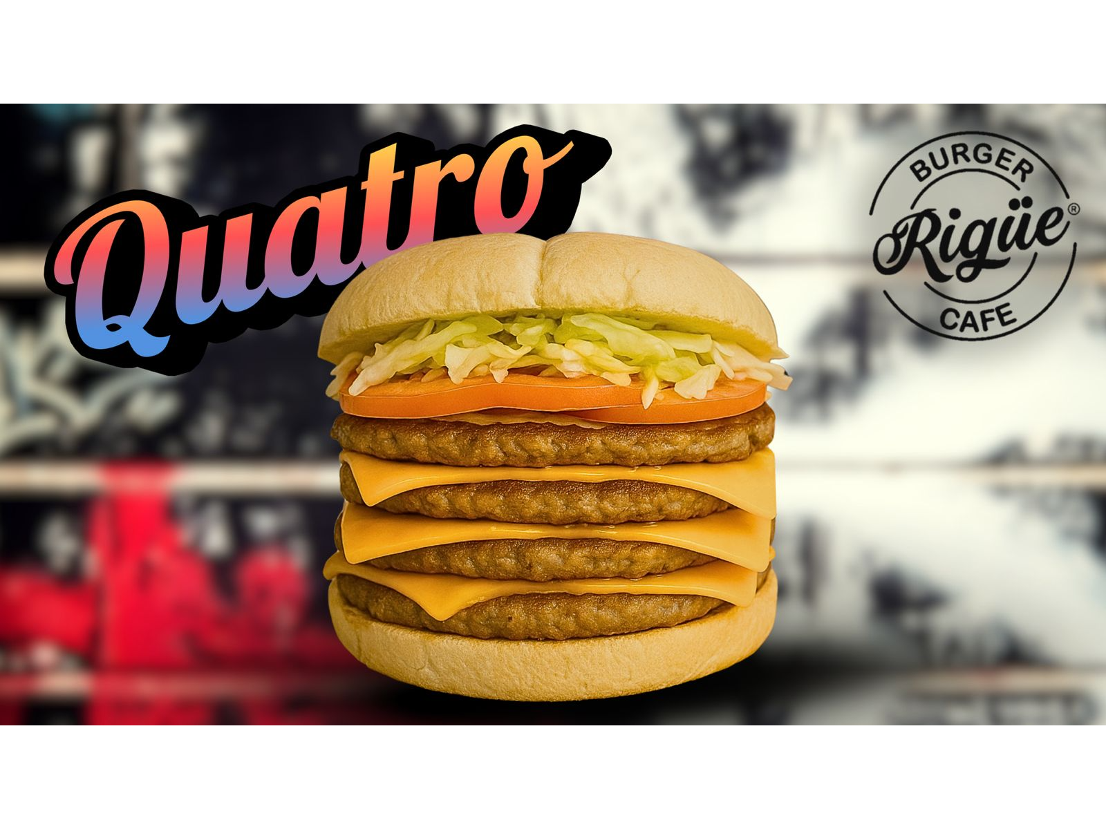 Quatro Compartir por WhatsApp Copiar enlace 4 medallones de carne - cheddar - lechuga - tomate - papas fritas - gaseosa Presentaciones Seleccioná una opción.QUATRO XL 4 medallones de carne 125g - cheddar - lechuga - tomate - papas fritas - gaseosa $17.900QUATRO XXL 4 medallones de carne 198g - cheddar - lechuga - tomate - papas fritas - gaseosa $22.900QUATRO L 4 medallones de carne 55g - cheddar - lechuga - tomate - papas fritas - gaseosa $15.900 Personalizá tu selección Las siguientes opciones aplican para cada producto agregado. BEBIDAS Seleccioná una opción. Obligatorio Coca colaFantaSpriteAgua saborizadaAgua sin gasAgua con gasSIN BEBIDA-$1.000 Observaciones 0 / 150