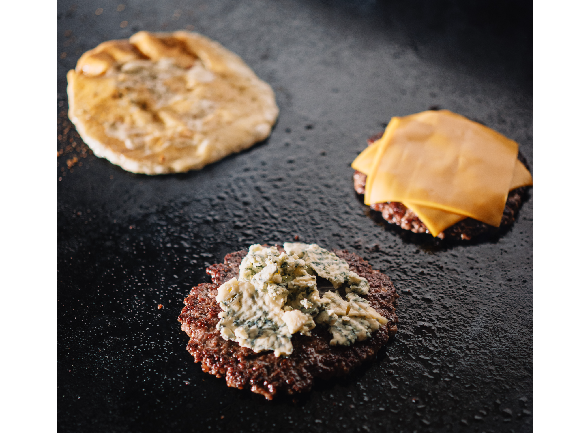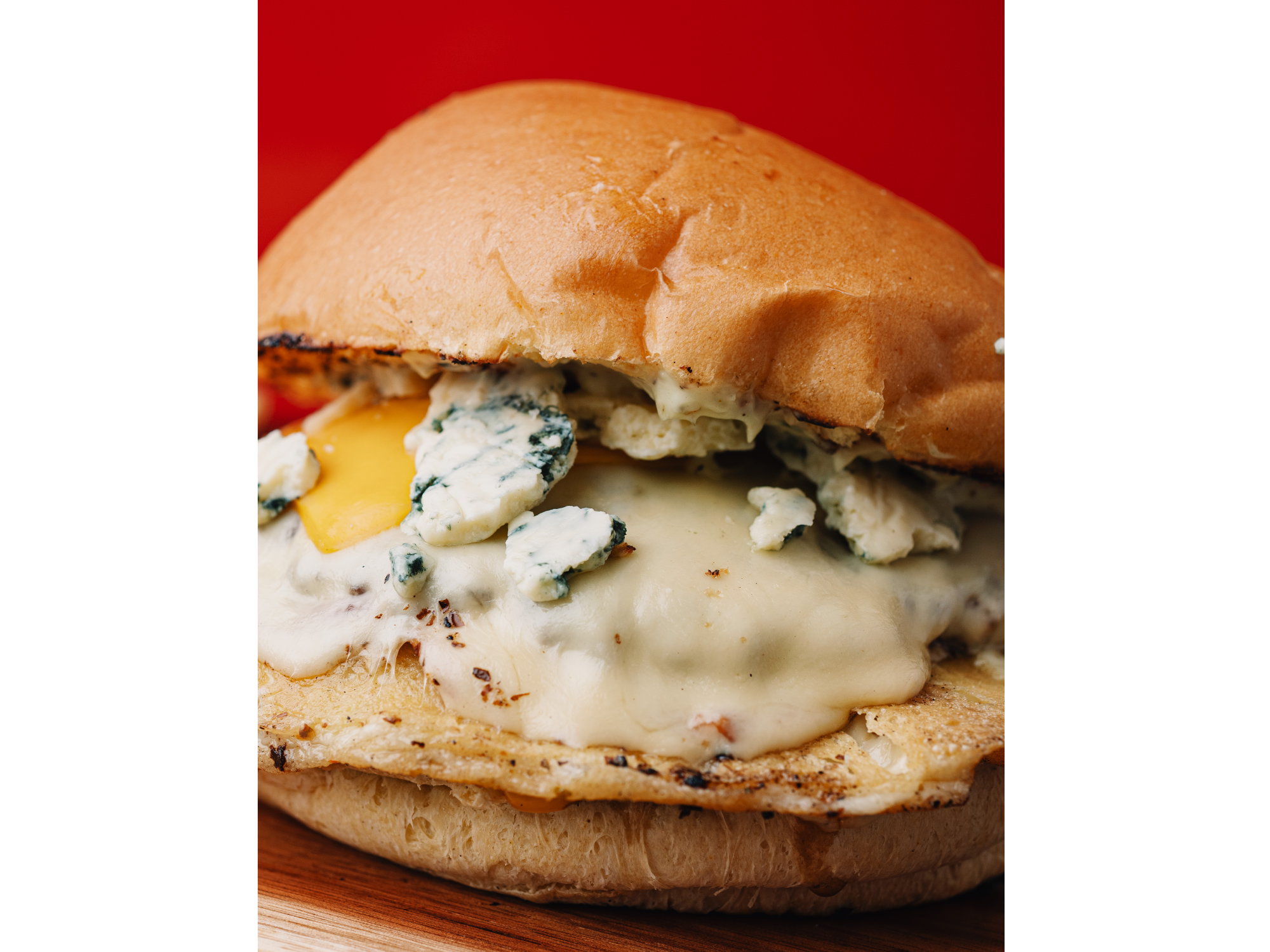 medallón de carne (blend de ROAS BEEF Y TAPA DE ASADO) (100 g) con 4 quesos, provoleta, doble tybo, doble cheddar, roquefort y salsa chebu en pan de papa, acompañada de papas fritas.