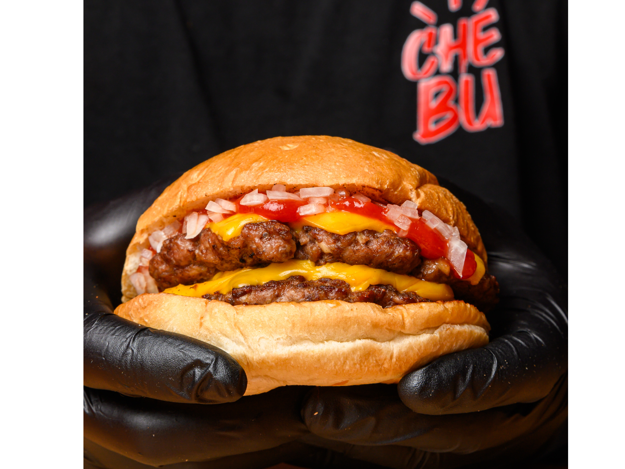 medallón de carne (blend de ROAS BEEF Y TAPA DE ASADO) (100 g) con DOBLE queso cheddar por medallón, kétchup, mostaza y cebolla blanca.