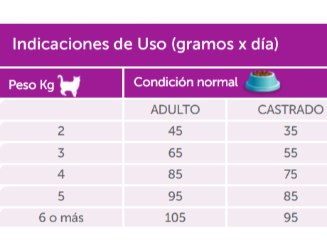 INGREDIENTES: Harina de pescado, harina de carne, harina de pollo, maíz pre-cocido, gluten de maíz, trigo, arroz, germen de trigo, harina de soja micronizada, salvado de trigo, levadura de cerveza, grasa de pollo, extracto de romero, extracto de yucca schidigera, harina de germen de maíz desgrasado, aceite de girasol de alto oleico, metionina, sal, celulosa, zeolita, manano oligosacáridos, inulina, pulpa de remolacha (fructo oligosacáridos), sorbato de potasio, colina, taurina. Antifúngico: ácido propiónico y propionato de calcio, acidificante: bisulfato ácido de sodio, antioxidante: BHT/BHA/ácido cítrico/EDTA, saborizante: hidrolizado proteico de pollo. Núcleo Vitamínico Mineral: Vitaminas: A, B1, B2, B6, B12, D3, E, K3, ácido fólico, ácido pantoténico, ácido nicotínico. Minerales: iodato de calcio, óxido manganoso, óxido de cobre, sulfato ferroso, manganeso, óxido de zinc, selenio.