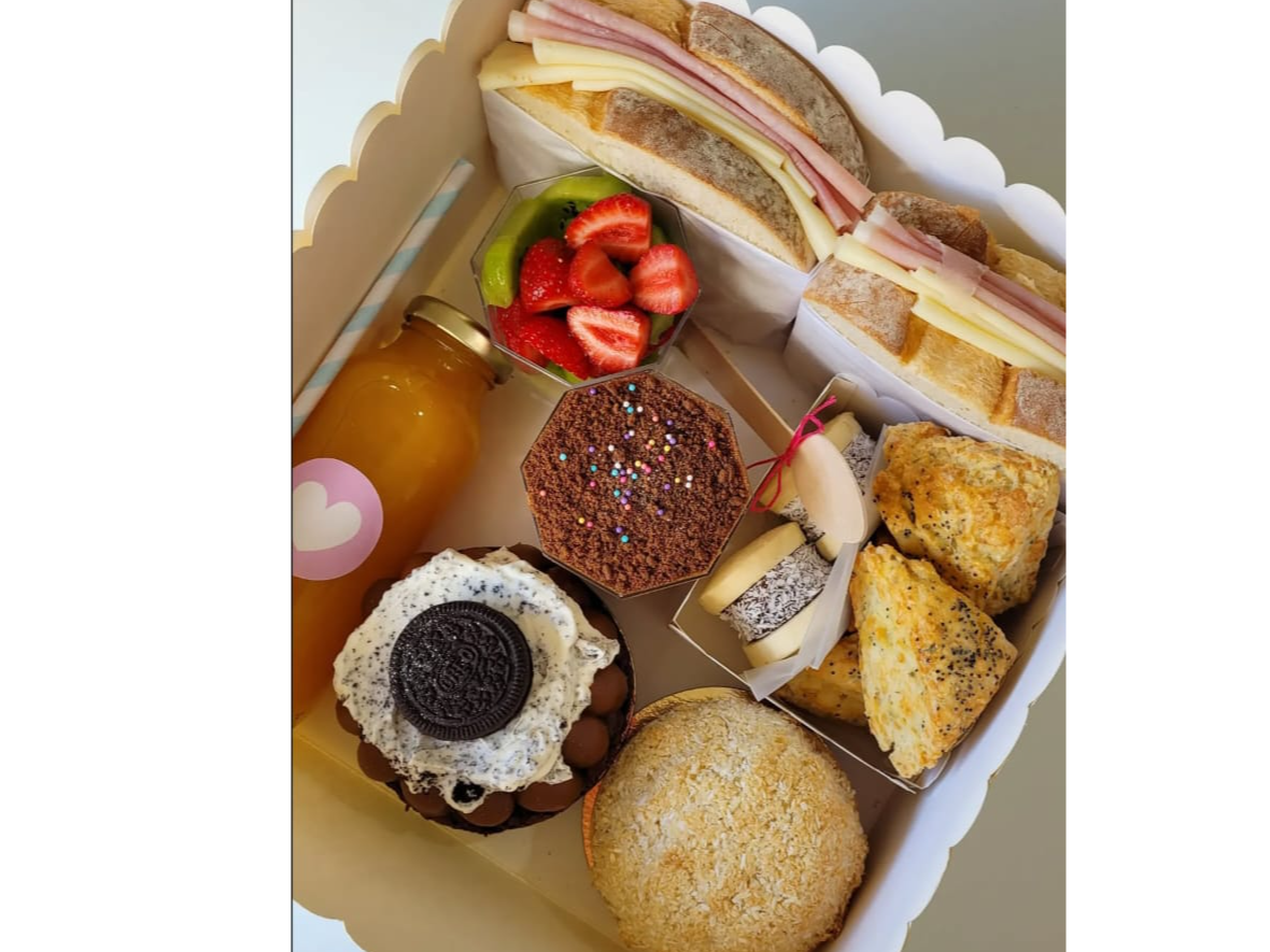 Incluye una tartita Kabsha o de coco, marquise con frutillas o con Oreo, scons de queso, sándwich de bondiola, alfajores de maicena, postre frutal, sándwich de pan de campo con jamón y queso y jugo de naranja bien fresco.