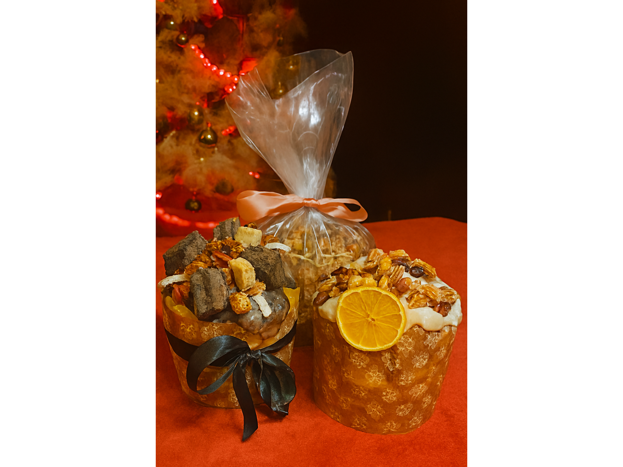 Pan dulce con chips de chocolate, avellanas y nueces, bañado en una cobertura de chocolate semiamargo.