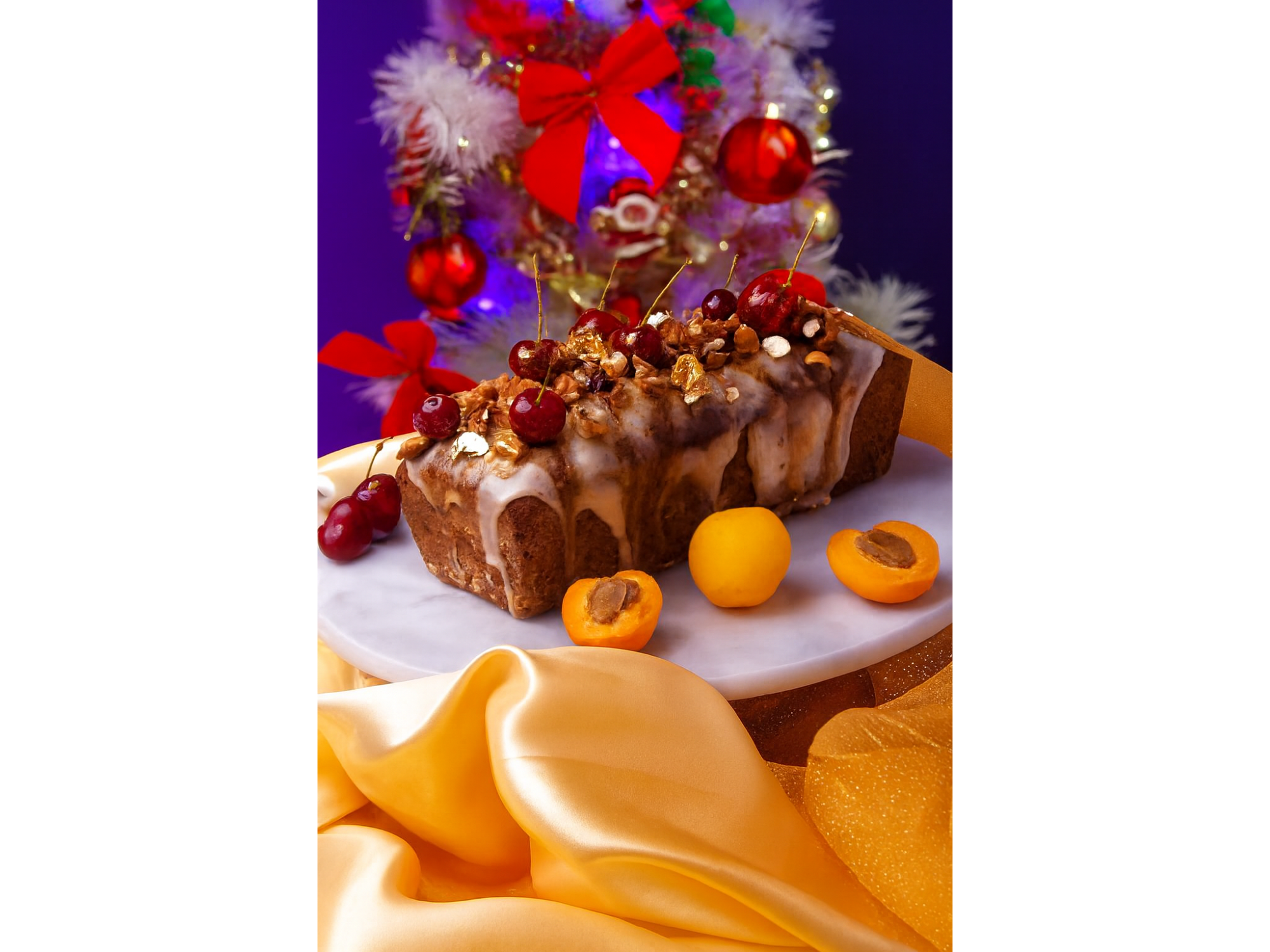 Clásico y tentador, preparado con una masa húmeda y perfumada, llena de frutas abrillantadas, frutos secos y especias que le dan ese sabor tradicional tan querido. Está bañado con un glaseado suave que realza todo su aroma, y coronado con nueces caramelizadas y cerezas, dándole un toque festivo y elegante. Ideal para la mesa dulce, para regalar o para disfrutar con un té en estas fiestas.