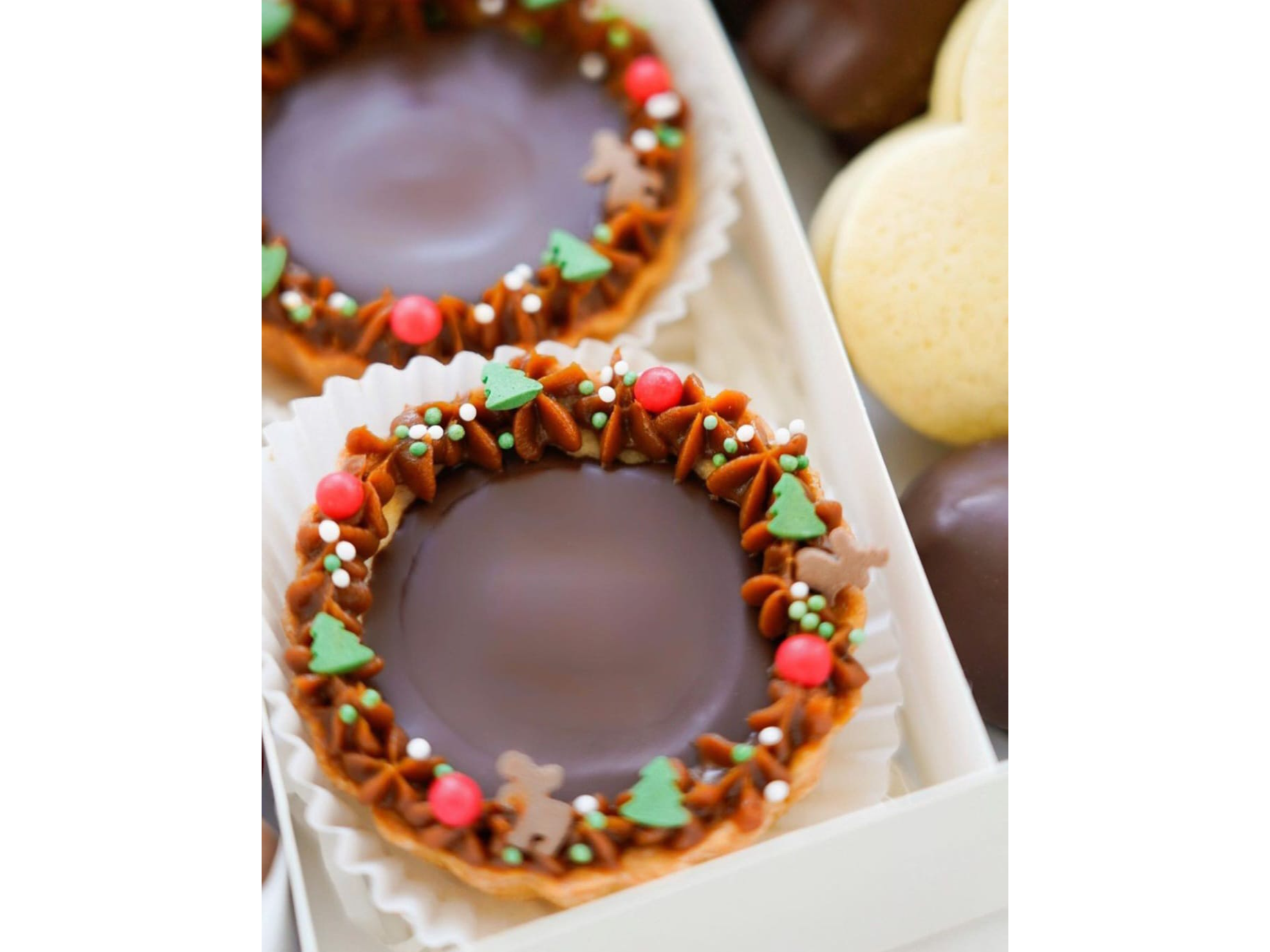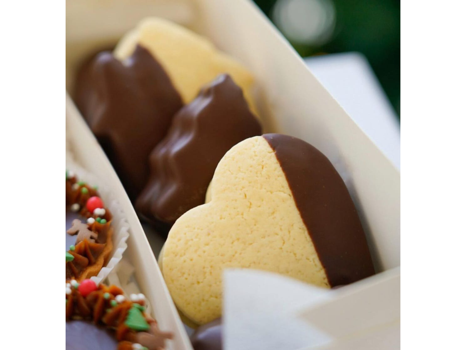 Incluye 5 alfajores de ganache con corazón de frutos rojos, bañados a la mitad en chocolate para un contraste perfecto; 3 alfajores de maicena con forma de arbolito navideño, suaves y delicados; 3 tartitas toffee con base crocante y centro cremoso; y un toque irresistible de maní bañado en chocolate, ideal para picar y compartir.