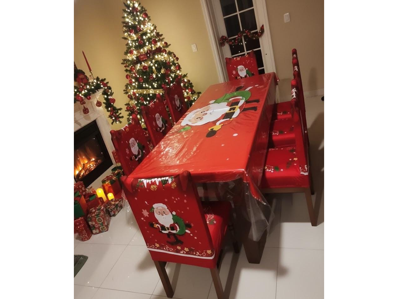 Juego de 9 piezas: 8 cubresillas + 1 mantel Papá Noel fondo rojo