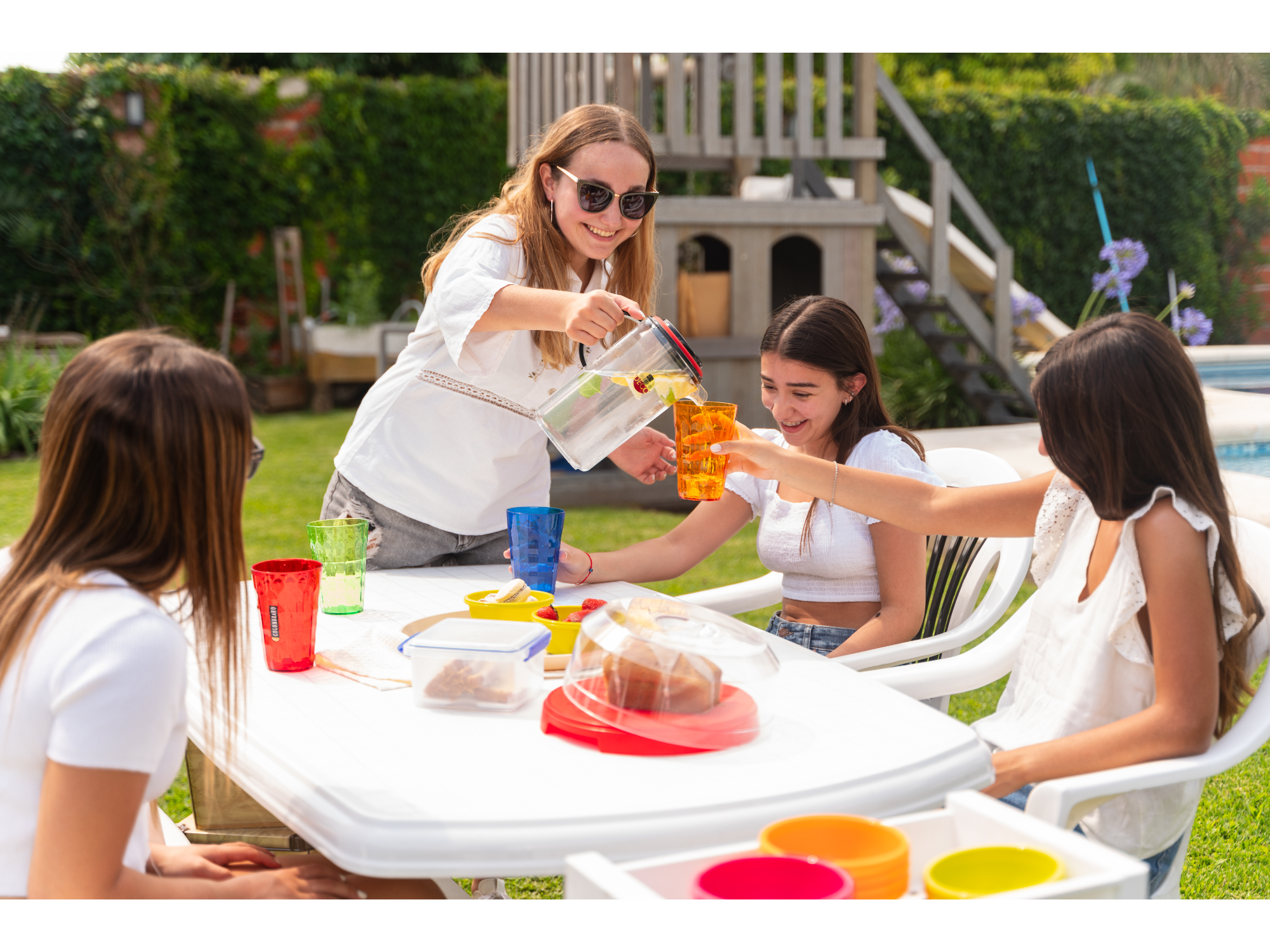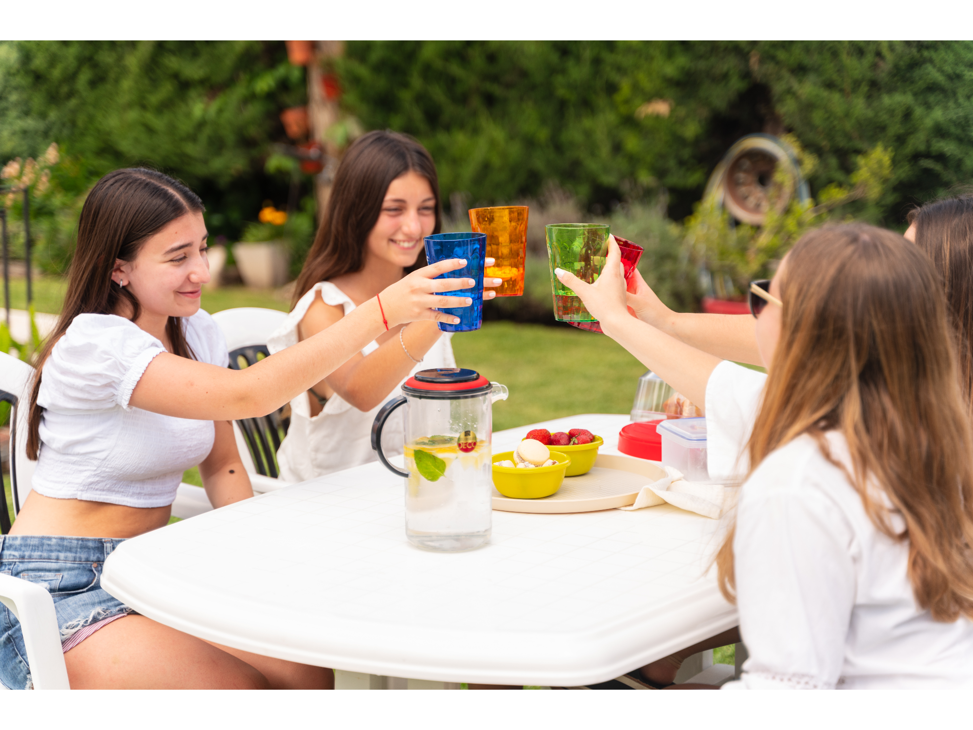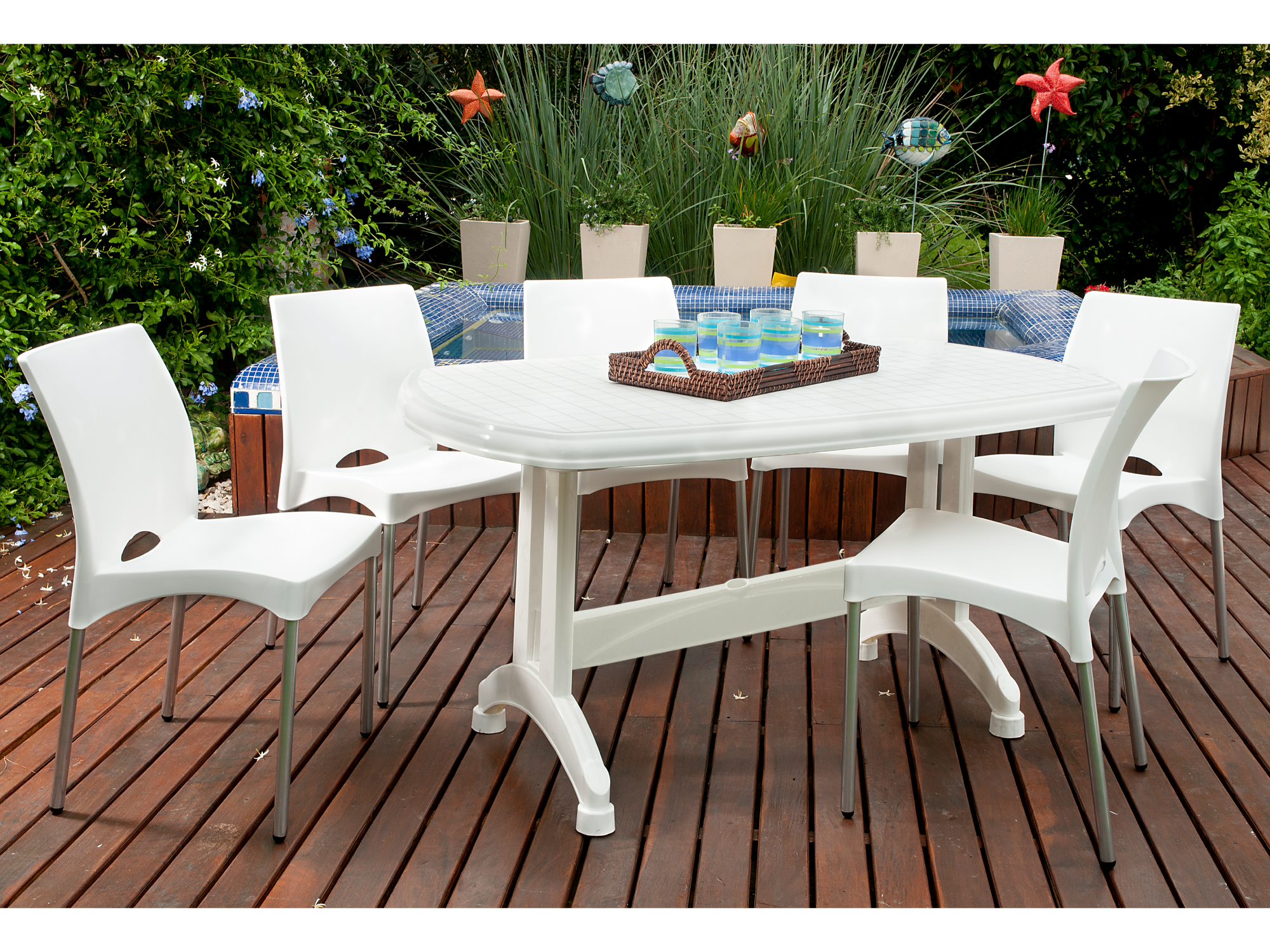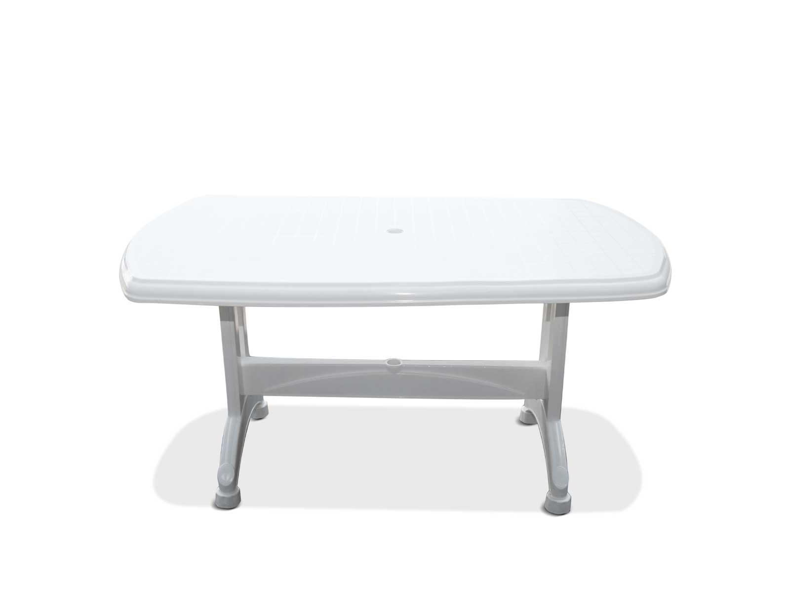 Funcional y práctica, esta mesa rectangular blanca plegable es ideal para jardines, balcones o patios. Cuenta con un sistema de regulación en cada pata para nivelar la mesa en cualquier superficie. Además, tiene un agujero central para colocar sombrilla, con tapa para cubrirlo cuando no se use.