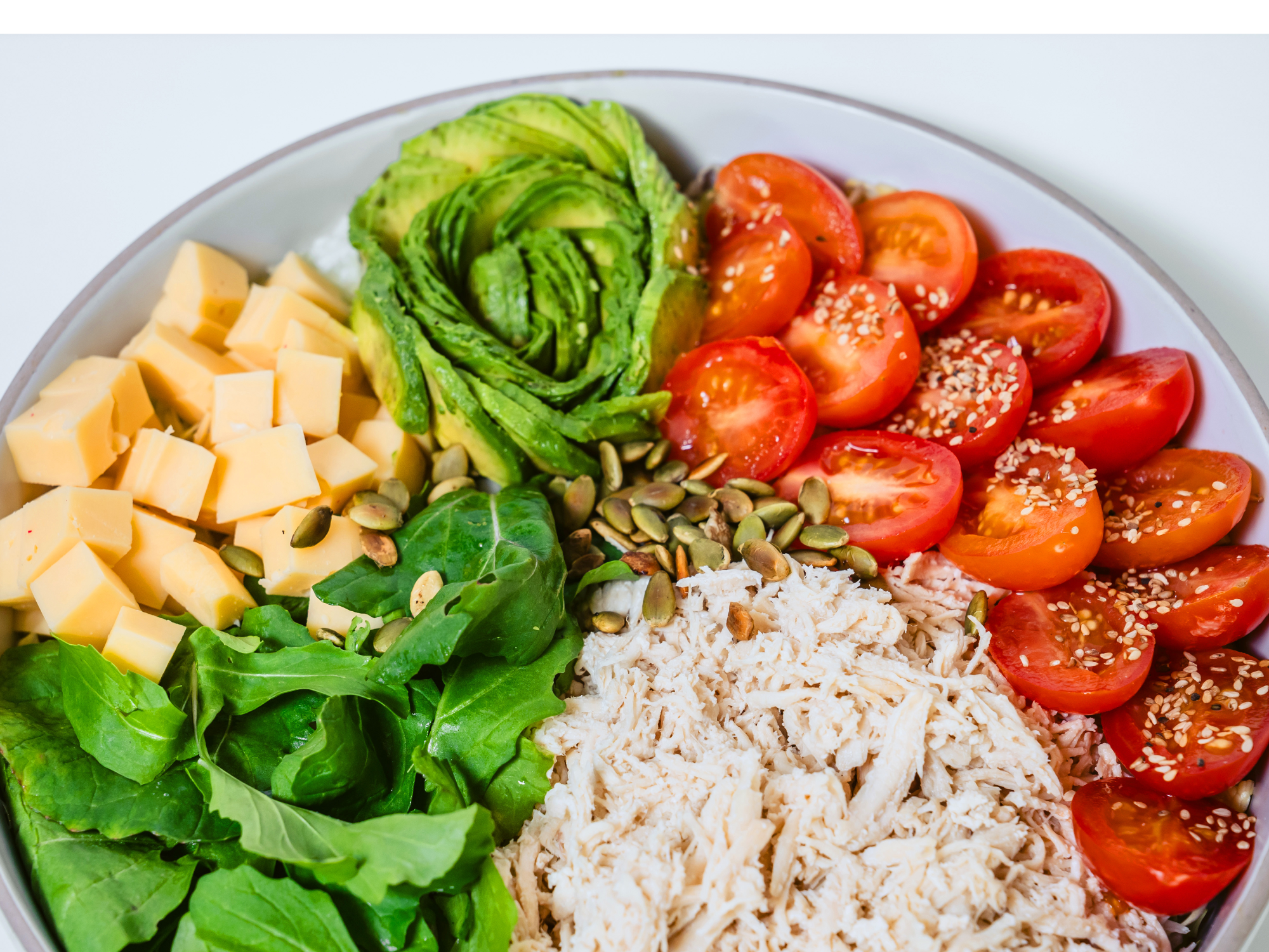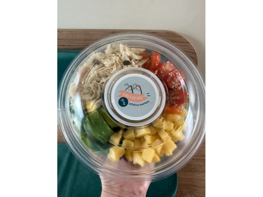 Bowl fresco con base lechuga repollada, rúcula, palta, pollo, queso, tomates cherrys con un touch de semillas de zapallo y sésamo + dressing de oliva, acceto y limón.
