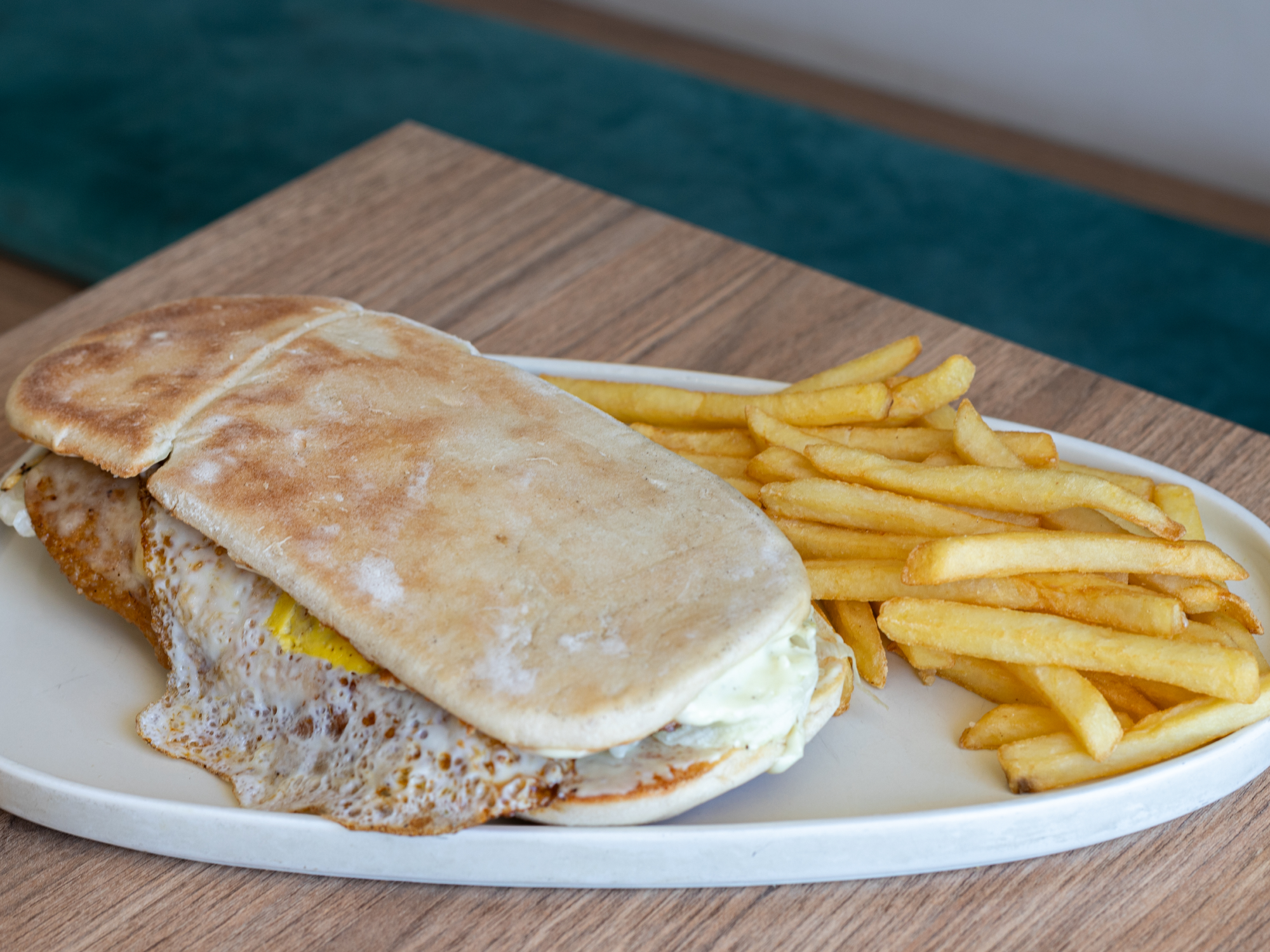 Pan de la casa grande, bife de seitán, queso, huevo, lechuga, tomate, mayonesa casera y papas fritas Mccain extracrocantes y de regalo, mayo de berenjena ahumada casera para untar tus papas :)