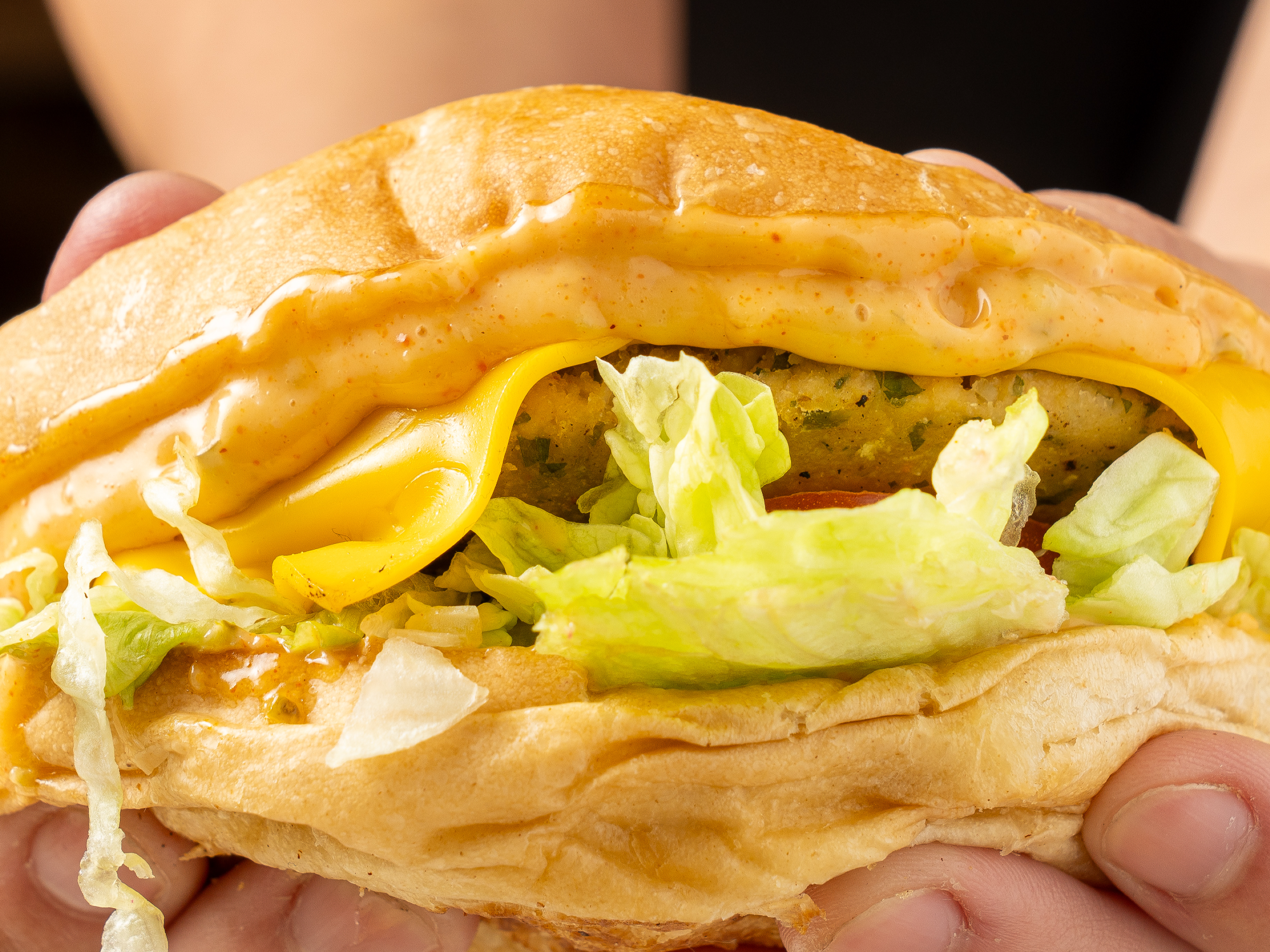 Pan de papa americano, medallón de falafel con doble feta de cheddar, lechuga, tomate, cebolla caramelizada, aderezo combi, ketchup con cebollita picada y papas crinkles McCain