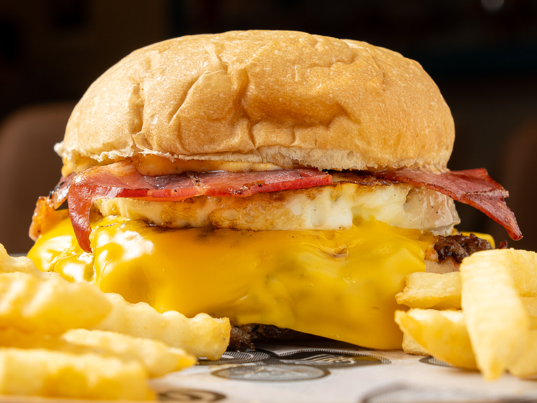 Pan de papa, medallon con blend de 3 carnes, doble huevo a la plancha condimentado con ciboulette, doble feta de cheddar, bacon, aderezo Combi, touch de ketchup con cebolla, acompañado de papas fritas mccain extra crocrante!