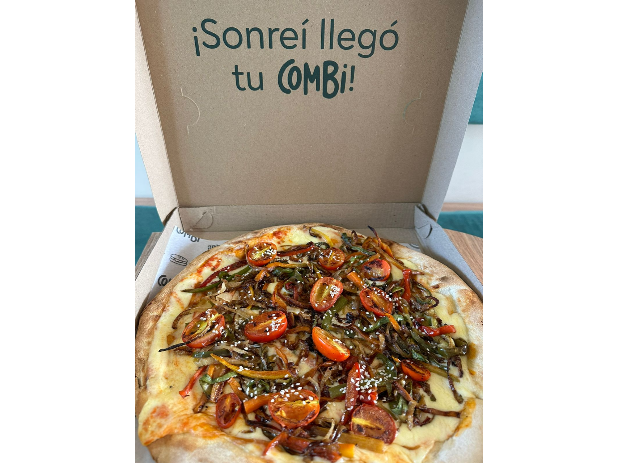Masa madre 8 porciones, salsa de toma, mozzarella, vegetales a la plancha (cebolla, pimientos, zanahorias, zucchinis, tomates cherrys), presentada con semillas de sésamo. De regalo, nuestra mayo casera de berenjenas ahumadas para untar los bordes 🧡