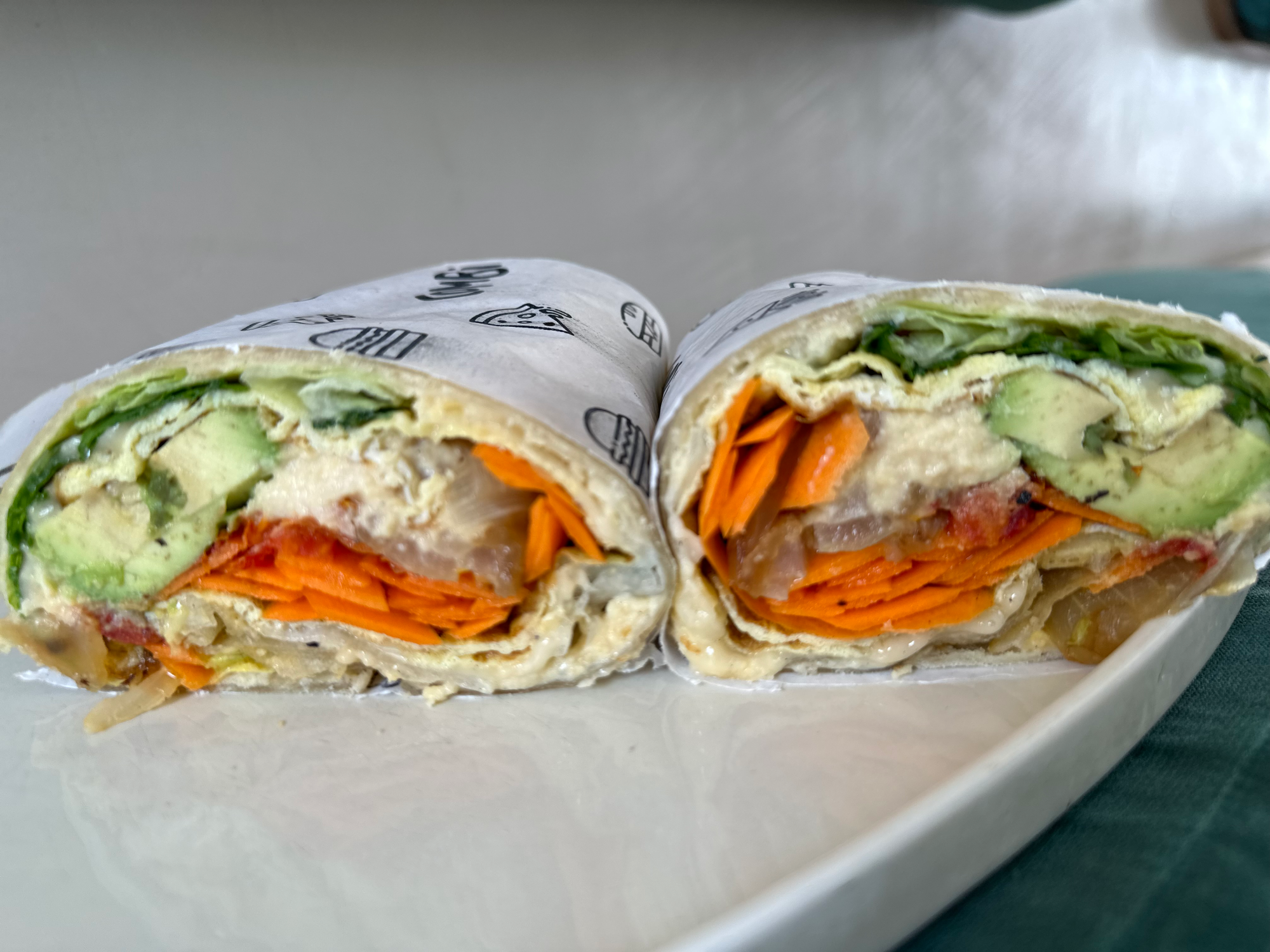 Exquisita tortilla de harina de trigo extra grande a la plancha rellena de hojas frescas de lechuga repollada, hojas de rúcula, humus casero (sin ajo) , palta, cebolla asada, tortilla de huevo a la plancha, hebras de zanahoria y un tocuh de tomates secos. Sale acompañado con nachos crujientes al estilo mexicano + dip de humus.