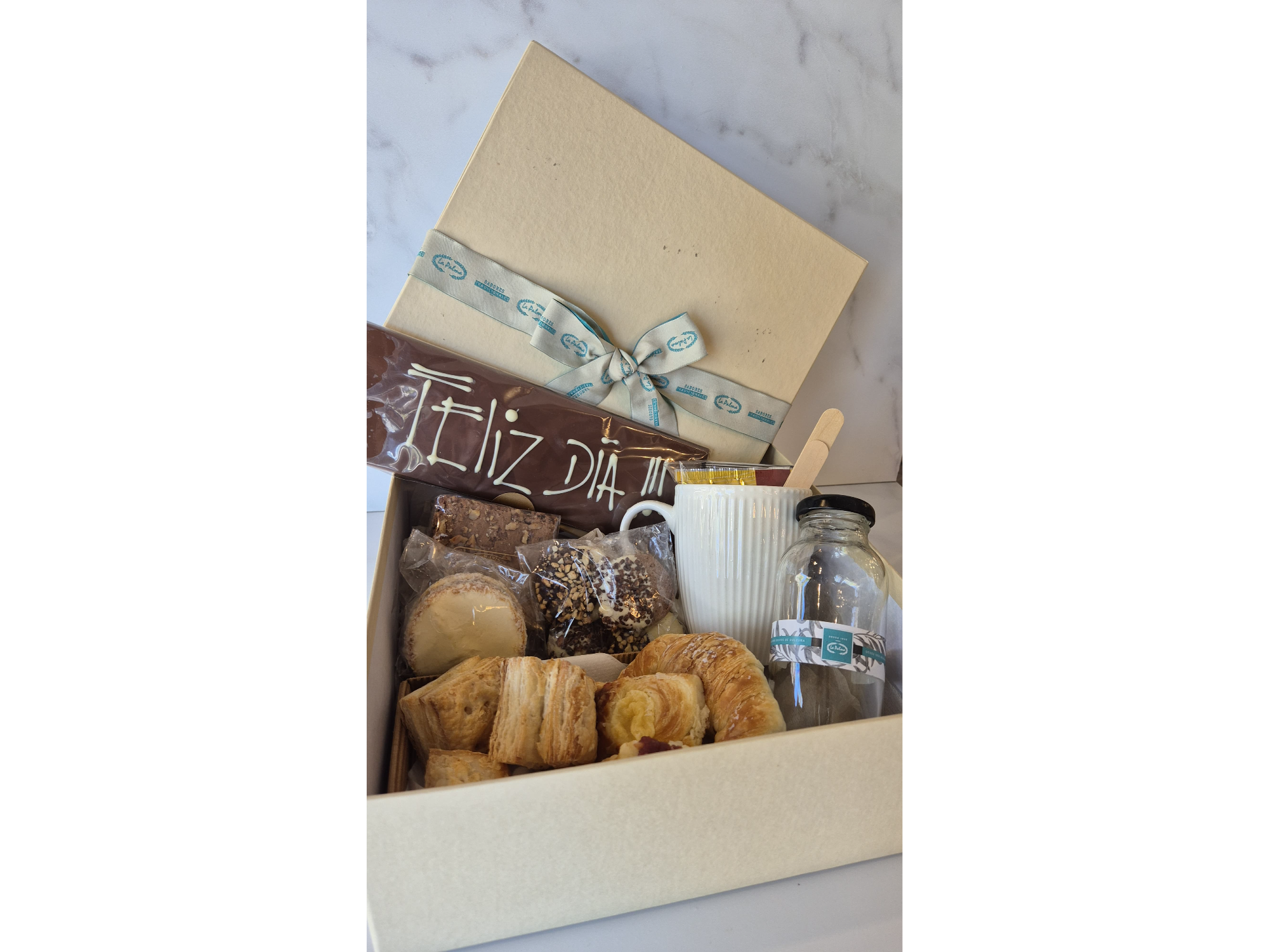 Taza, cuchara y untador, servilleta, café, te, sobre de leche, azúcar y edulcorante, botella con jugo de naranja, mermelada artesanal, manteca, dulce de leche, queso untable, medialuna salada, 3 bizcochos, 2 facturitas, 1 porción de brownie, 1 alfajor maicena, 4 masas secas, tableta de chocolate con inscripción. (INCLUYE ENVIO)