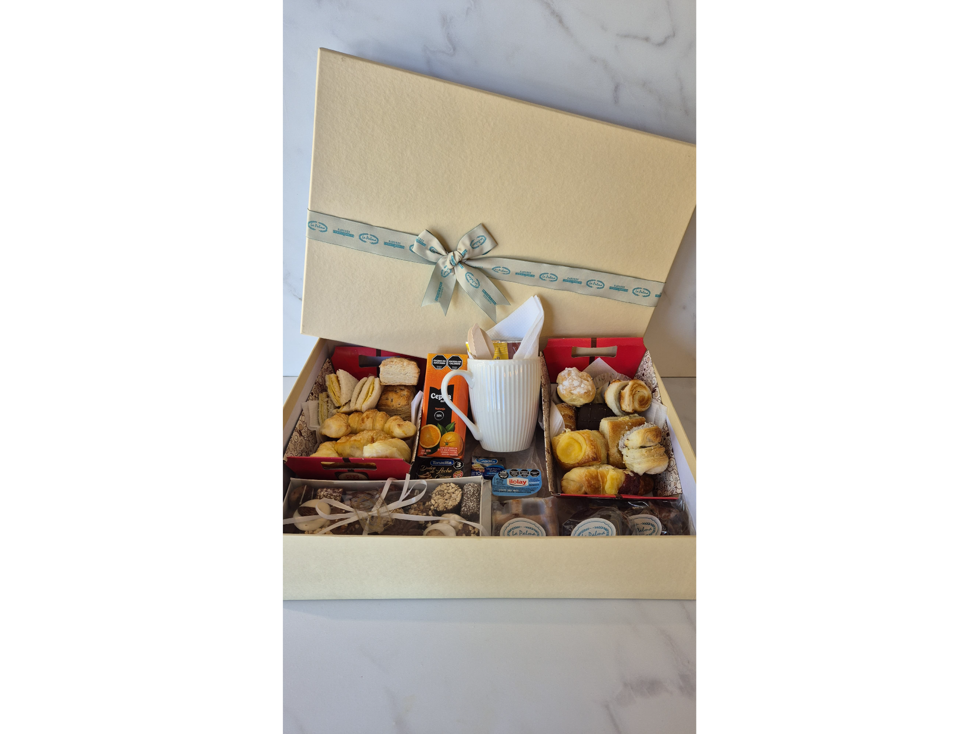 Taza, cuchara y untador, bombonera de 1/4 artesanal, servilleta, café, te, sobre de leche, azúcar y edulcorante, jugo de naranja, mermelada artesanal, manteca, dulce de leche, quedo untable, 2 medialunas saladas, 2 bizcochos, 4 facturitas, 6 masas finas, 1 porción de pasta frola, 1 alfajor marplatense, 4 masas secas, 4 triangulitos de miga (INCLUYE ENVÍO)
