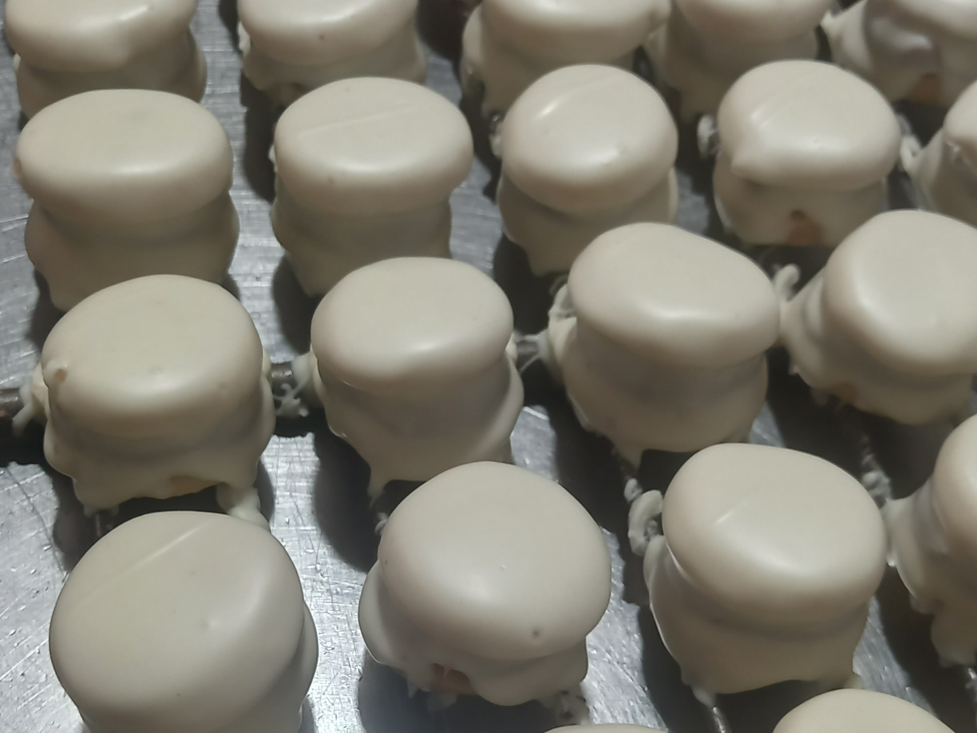 Alfajorcitos de dulce de leche bañados en chocolate blanco