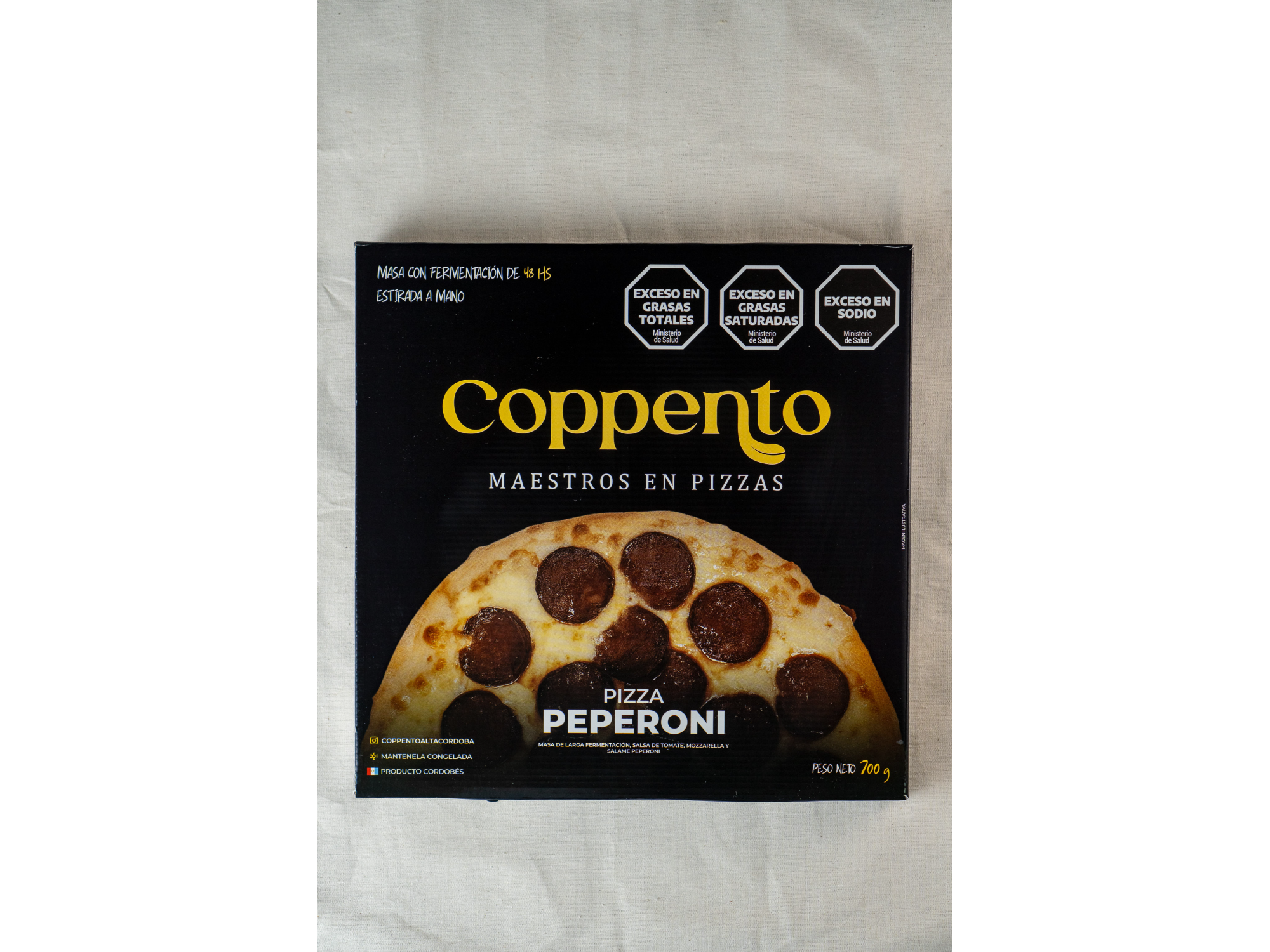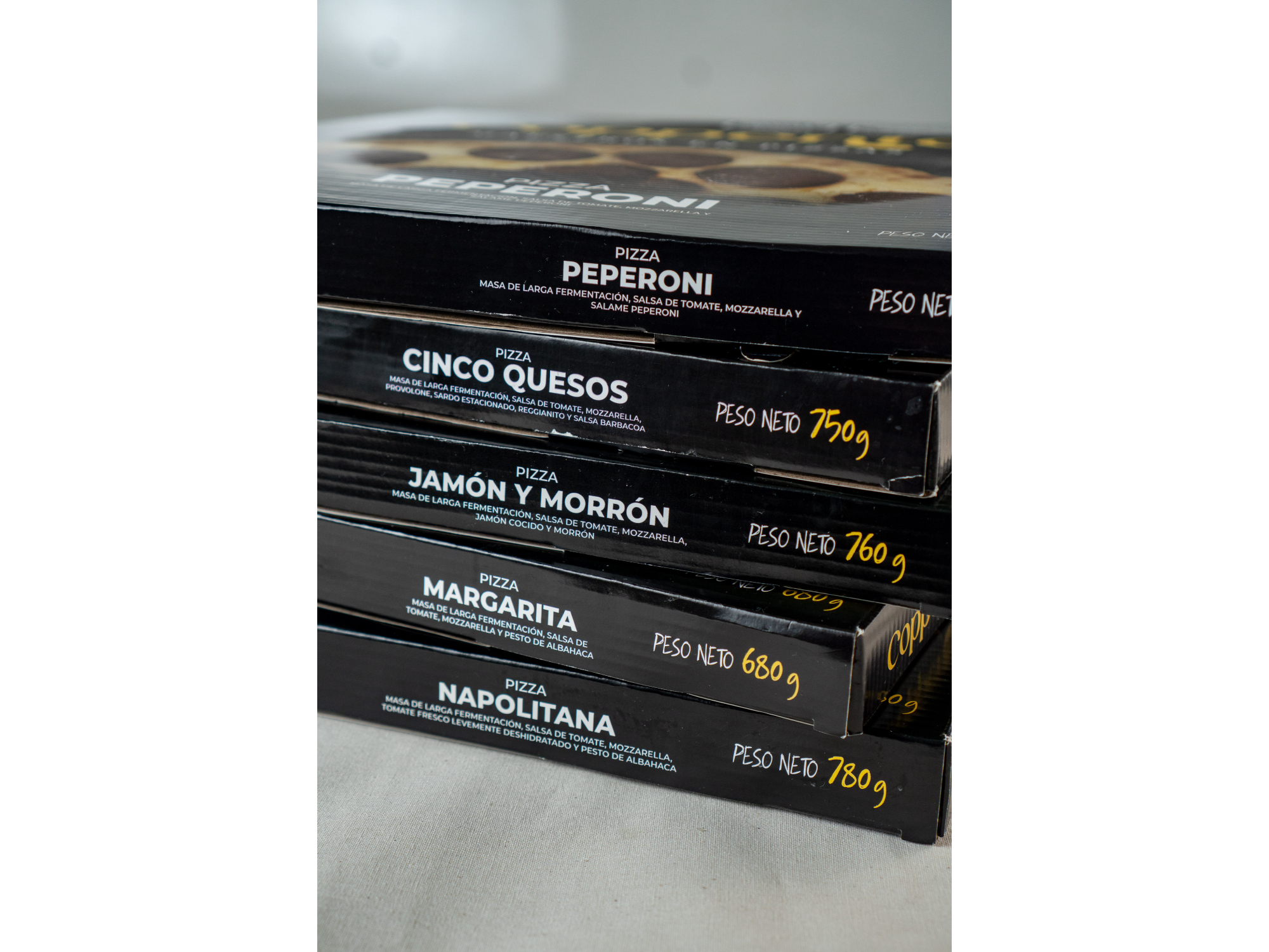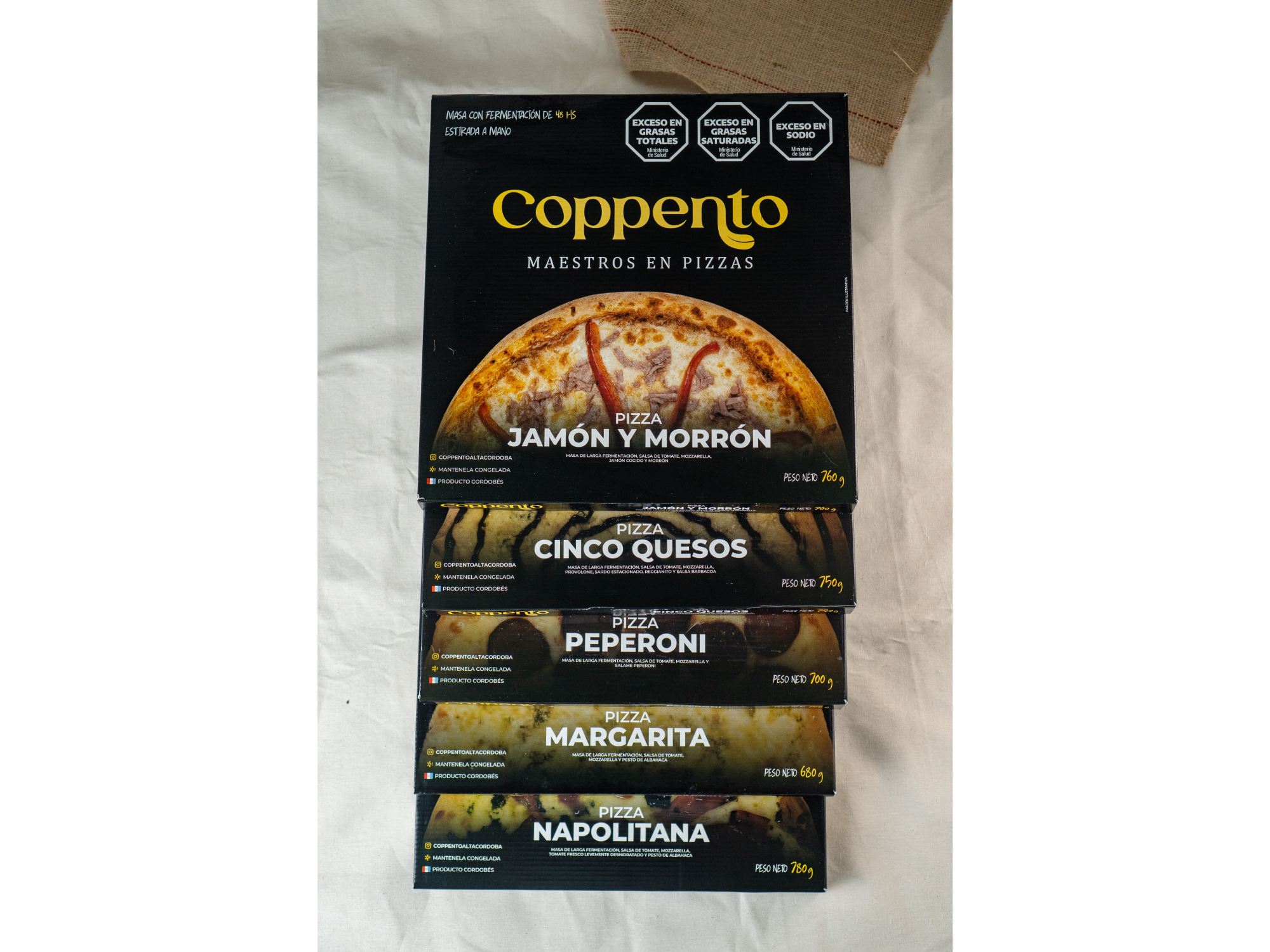 Pizzas congeladas para compartir Compartir por WhatsApp Copiar enlace Pizza de 48 hs de fermentación, hechas con un blend de harina orgánica y de fuerza Campodónico. Salsa de tomate orgánico y mozzarella Orcoví. Presentaciones Seleccioná las opciones que quieras.Napolitana Ingredientes: Salsa de tomate, queso mozzarella, tomates y pesto de albahaca. $9.500Peperoni Ingredientes: Salsa de tomate, queso mozzarella y peperoni. $9.900Margarita Ingredientes: Salsa de tomate, queso mozzarella, blend de quesos duros (reggianito y sardo estacionado) y espiral de pesto de albahaca. $8.700Cinco Quesos Ingredientes: Queso mozzarella, queso provolone, queso azul, queso reggianito, queso sardo estacionado y salsa Frida. $9.500Jamón y morrón Ingredientes: Queso mozzarrella, jamón cocido y morrón. $9.500 Observaciones 0 / 150