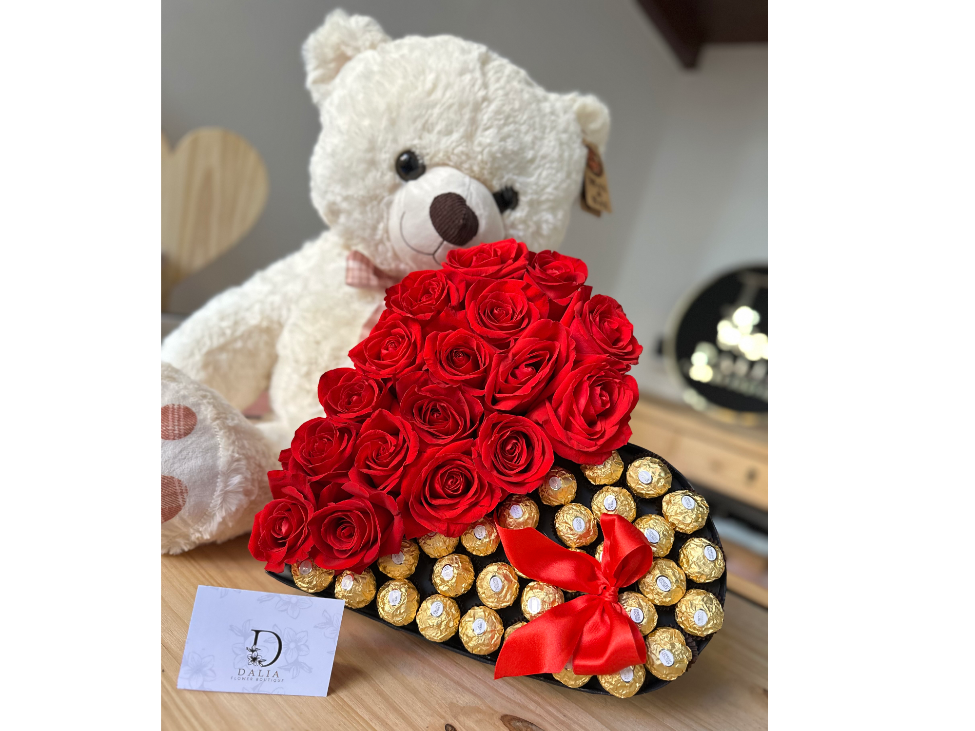 ✨ Maxi – Corazón de Oro ✨ Un regalo que deslumbra y enamora. ❤️ Este exclusivo box en forma de corazón combina la pasión de 25 rosas rojas frescas con la dulzura dorada de 30 bombones Ferrero Rocher, creando una experiencia única que transmite amor, elegancia y sofisticación. Perfecto para sorprender en aniversarios, cumpleaños, San Valentín o simplemente para decir “te amo” de la manera más especial. Incluye tarjeta dedicatoria personalizada de obsequio. 🎁 💎 Un detalle inolvidable, tan grande como tus sentimientos