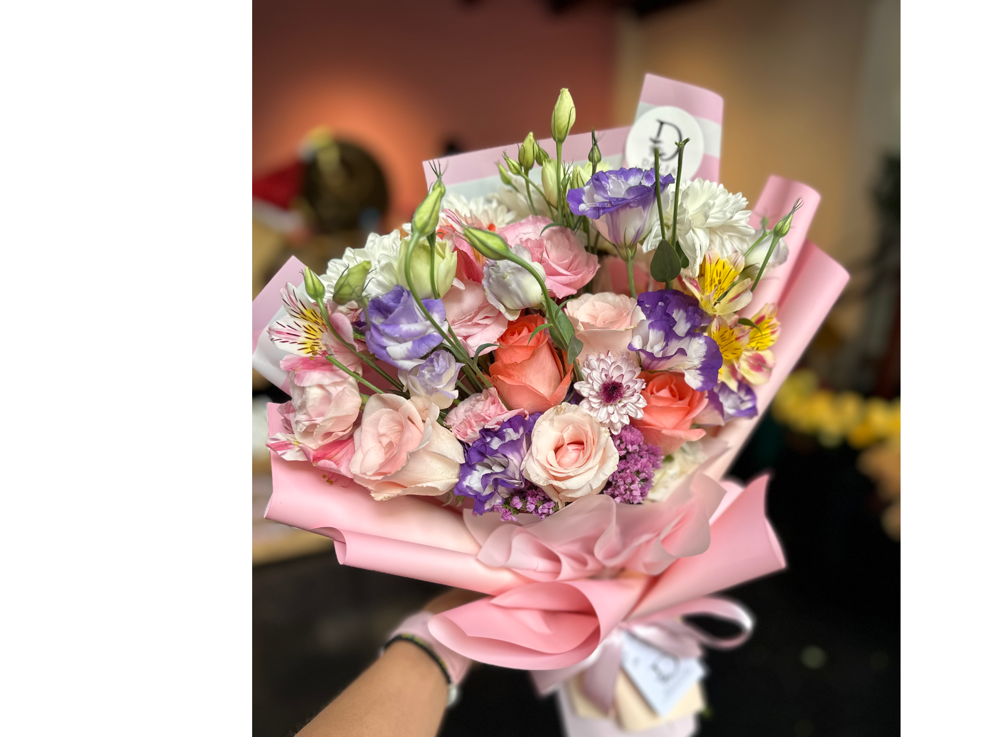 Dulce Aura está compuesto por rosas en tonos rosas, blancos o amarillos (según disponibilidad), manteniendo siempre la gama rosa como protagonista, acompañadas de flores de relleno de estación como lisianthus, margaritas, manzanillas, statice y crisantemos, que aportan textura, volumen y un estilo romántico y etéreo.
