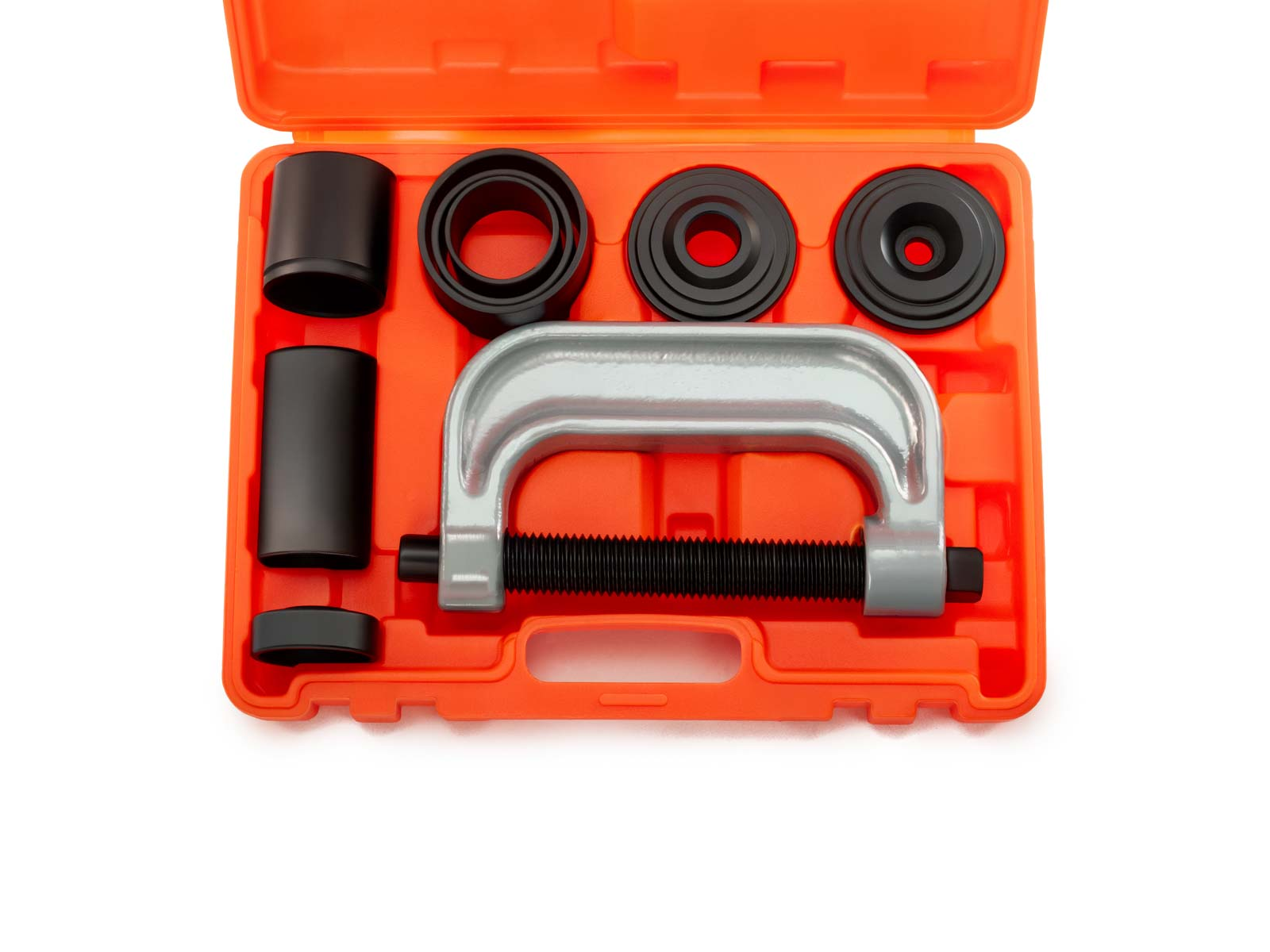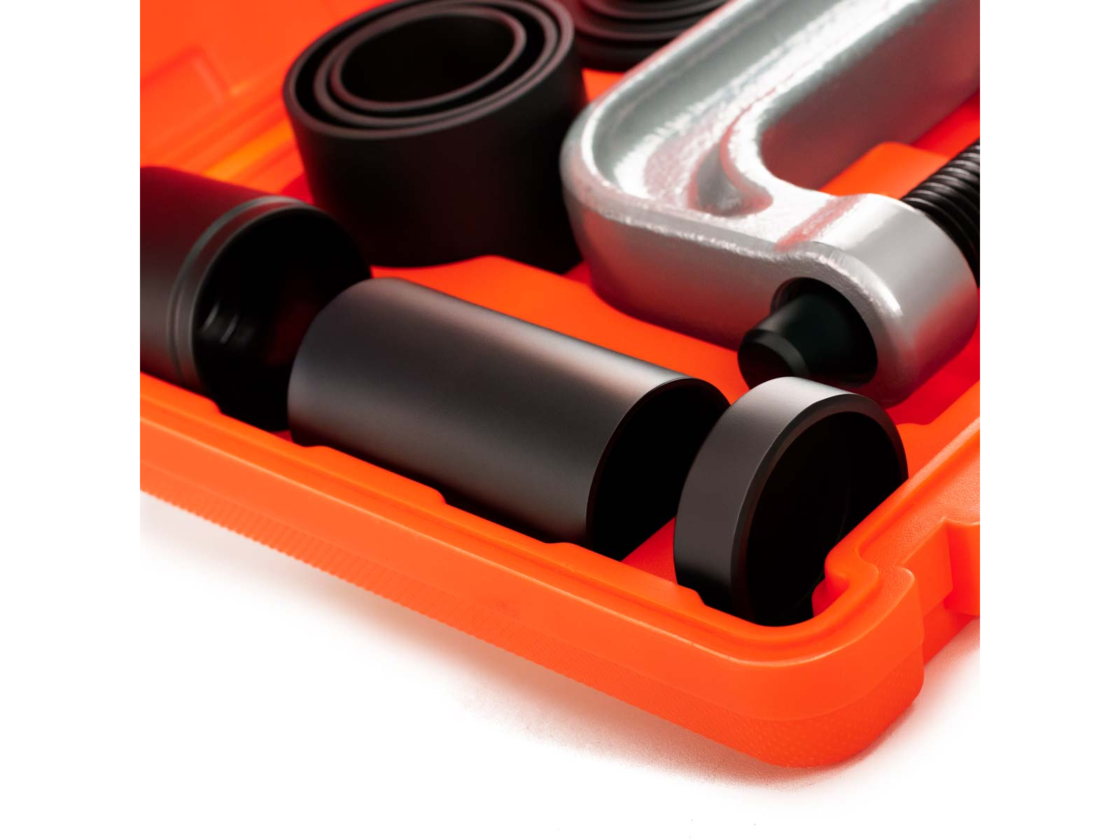 Fabricado en acero aleado de alta resistencia, ofrece durabilidad y fiabilidad en cada uso. Su garra en “C” con ajuste universal, las 3 bases de apoyo y los 5 cilindros incluídos aseguran una sujeción firme y un alineamiento preciso durante el proceso de extracción o montaje.