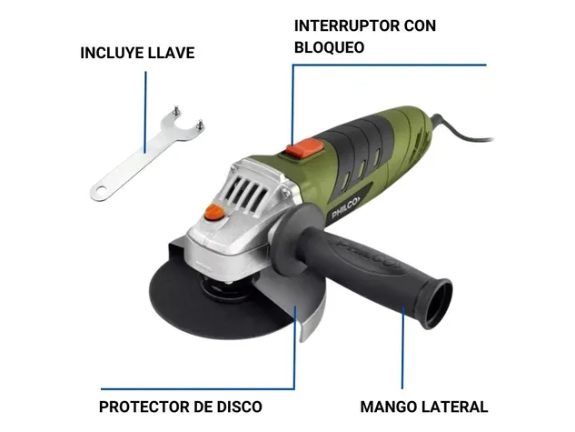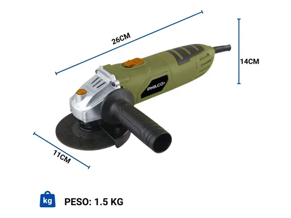 17587Amoladora Angular Philco 710w Compartir Medidas y Especificaciones: -Voltaje: 220V -Potencia: 710W -Velocidad: 11.000 rpm -Diámetro del disco: 115 mm -Dimensiones: 26 cm (largo) x 13 cm (ancho) x 10 cm (alto) -Peso: 1,5 kg -Mango lateral para mejor control$63.100 Observaciones 0 / 150