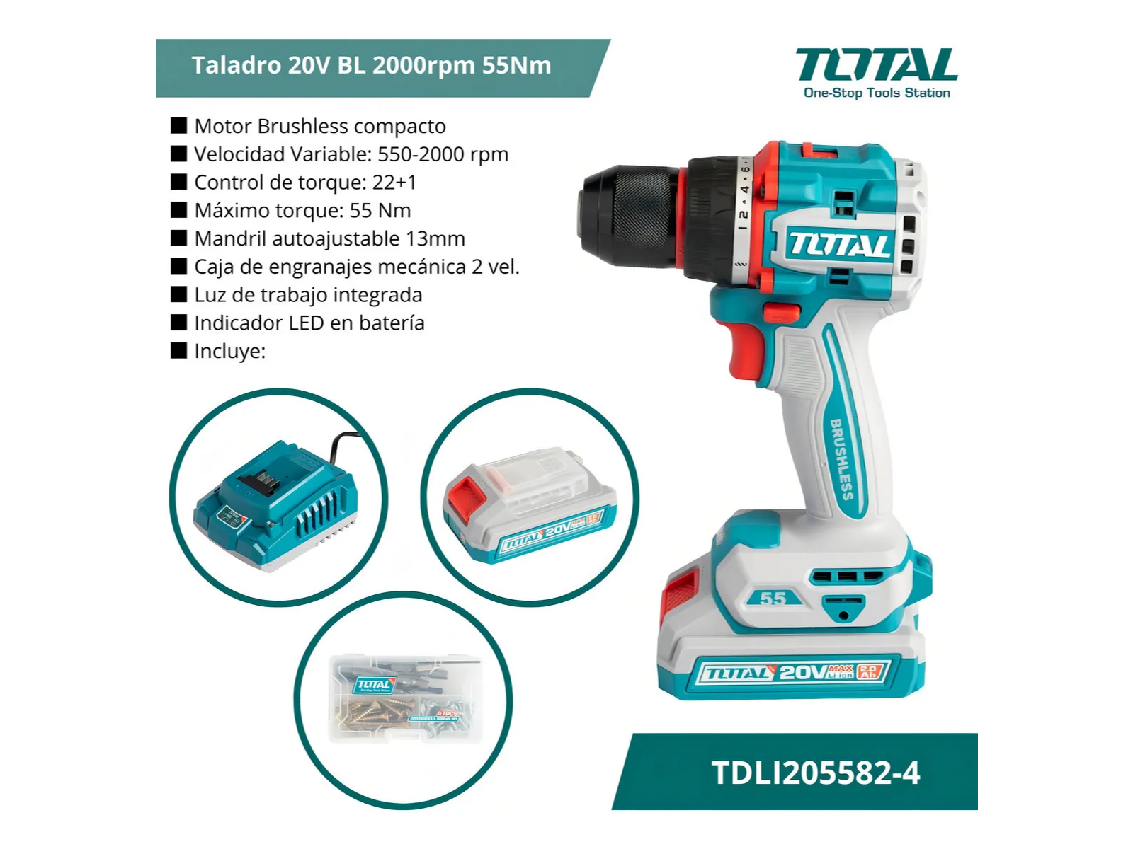 Última unidad Taladro Atornillador TOTAL 20V Brushless 55Nm con Batería y Cargador