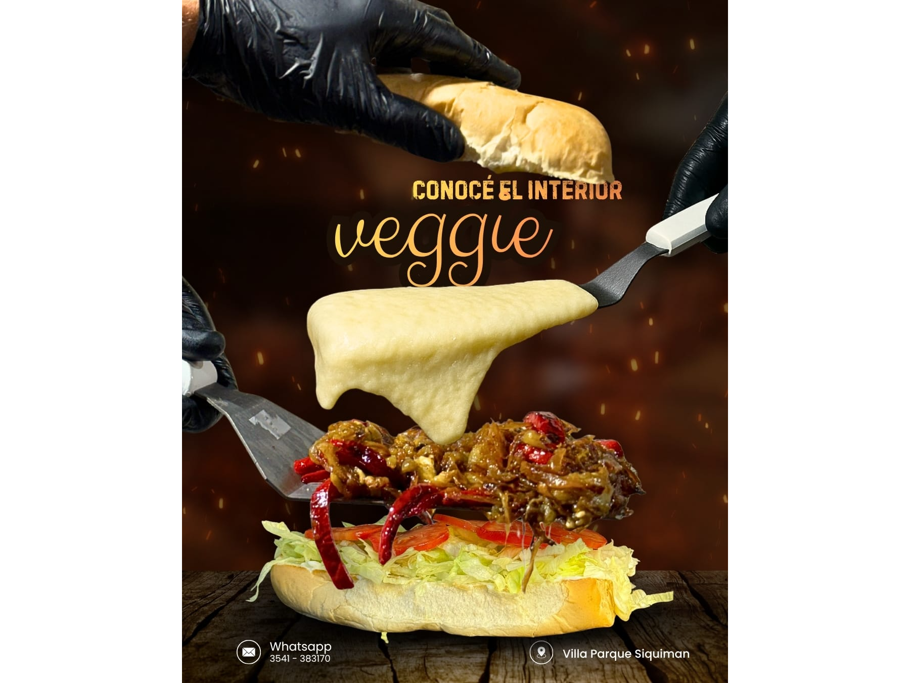 Pan de lomo, berenjenas asadas, cebollas salteadas, pimintos, queso fundido, huevo, lechuga, tomate mayonesa y papas fritas.