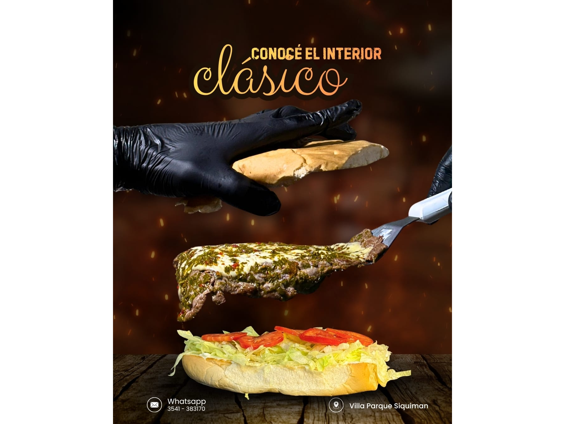 Bife 100% CARNE DE LOMO (140gr), queso, mayonesa, savora, salsa golf, lechuga, tomate, CHIMI DEL PUEBLO y papas fritas.