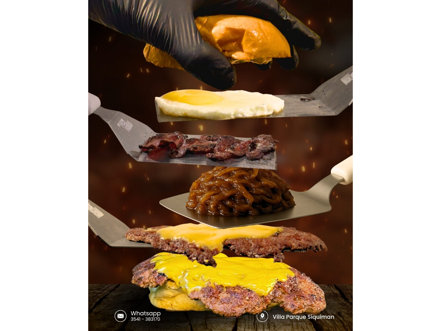 DOBLE MEDALLON DE NUESTRO BLEND, huevo, cebolla caramelizada ,cheddar, bacon, barbacoa y papas fritas.