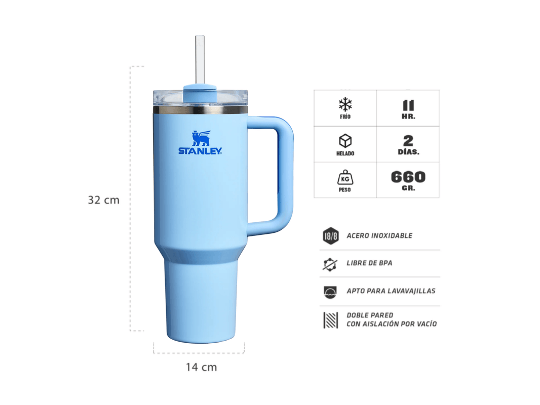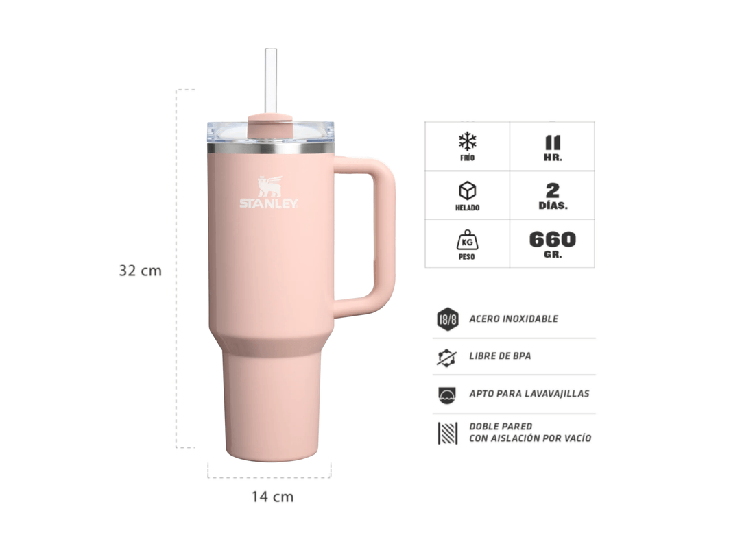 Construido con acero inoxidable, nuestro vaso Quencher ofrece la máxima hidratación con menos recargas. Al ir al trabajo, al entrenamiento o a las excursiones de un día, querrás tener este vaso a tu lado. Gracias al aislamiento al vacío de Stanley, tus bebidas se mantendrán heladas, hora tras hora. La tapa FlowState™ avanzada cuenta con una cubierta giratoria con tres posiciones: una abertura diseñada para resistir las salpicaduras mientras mantiene el sorbete en su lugar, una abertura para beber y una tapa de cobertura completa. El asa ergonómica incluye inserciones de agarre cómodo para transportarlo con facilidad, y la base angosta se adapta a casi cualquier portavasos de vehículo.