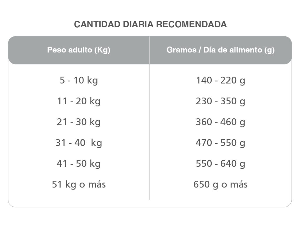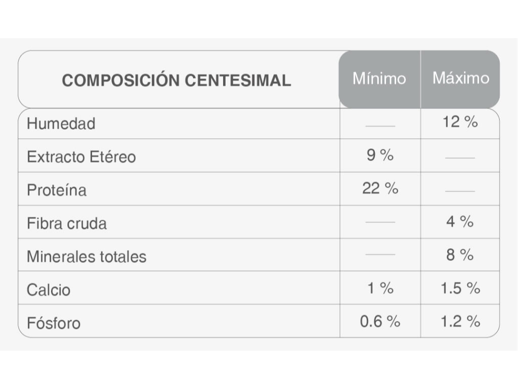 Harina de carne vacuna, harina de pollo, aceite de pollo, maíz, gluten de maíz, trigo, germen de maíz, salvado de trigo, harina de soja, arveja, grasa vacuna, levadura de cerveza, pulpa de remolacha (fuente de fructo-oligosacáridos), sal yodada; hidrolizado proteico de pollo, ácido cítrico, tocoferoles, dipropionato de amonio, ácido propiónico; núcleo vitamínico-mineral: vitaminas A, D3, E, K, B1, B2, B6, B12, ácido fólico, ácido nicotínico, ácido pantoténico, biotina, colina; minerales: zinc, hierro, cobre, yodo, manganeso, selenio.