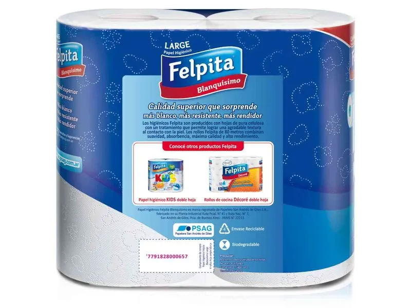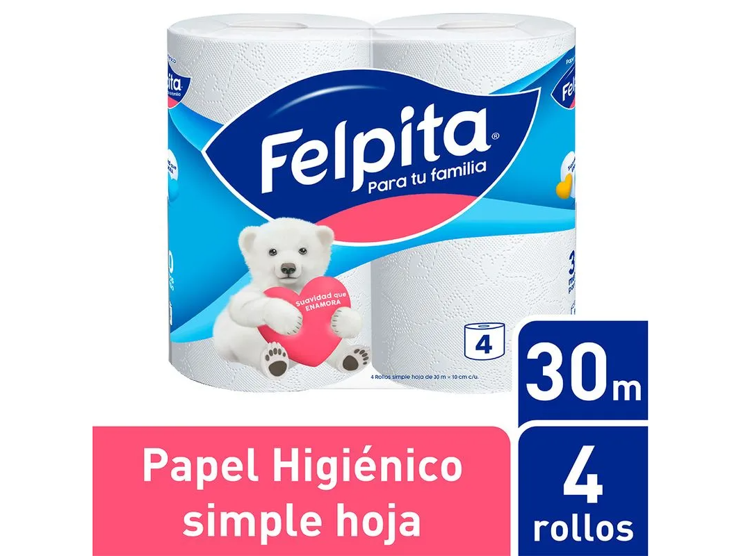 PAPEL HIGIENICO FELPITA 4 X 30 MTS 0046EL PRECIO CORRESPONDE A 1 PAQUETE DE 4 X 30 SIMPLE HOJA, EL BOLSON TRAE 12 PAQUETES DE 4 X 30 MTS Presentaciones Seleccioná las opciones que quieras.COMPRANDO 10 BOLSONES DE 12 PAQUETES DE 4 X 30 MTS (MINIMO 120 UNIDADES) DEBE SELECCIONAR 120 UNIDIADES O MAS $1.051,15COMPRANDO 1 BOLSON DE 12 PAQUETES DE 4 X 30 MTS (MINIMO DE COMPRA 12 UDS) DEBE SELECCIONAR 12 UNIDADES O HASTA 108 EN MULTIPLOS DE 12 $1.080,90 Observaciones 0 / 150 Encontrá productos relacionados LO TENES QUE TENER (73) SE AGOTA RAPIDO (44)