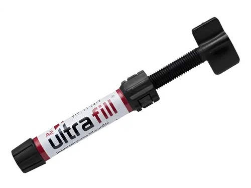 Composite ULTRA FILL Resina compuesta fotocurable para restauración. Resina micro híbrida indicada para restauraciones dentales estéticas definitivas, anteriores o posteriores, fijación de los dientes con movilidad, reparaciones de restauraciones indirectas. Fotocurable. Tiene partículas inorgánicas con variación entre 0.04 y 2.2 um. Presenta volumen total de carga inorgánica de 79%. Presenta propiedades de fluorescencia, excelente acabado y pulido, así como óptimas propiedades mecánicas, permitiendo utilizarlo en restauraciones anteriores, incluso carillas como también en superficies oclusales. Es radiopaco. Presentación: Jeringa x 4g. Marca: MD Origen: Argentina