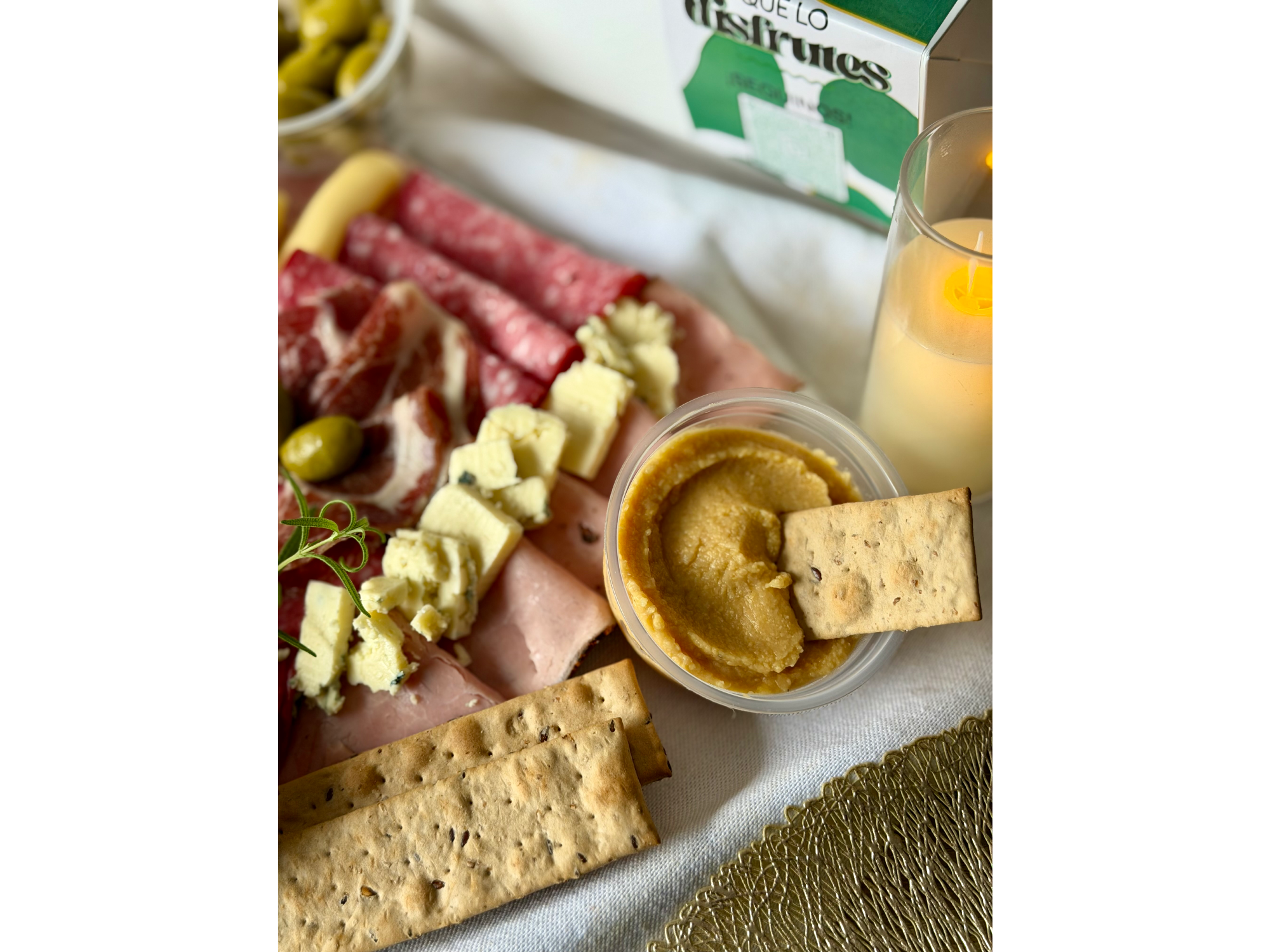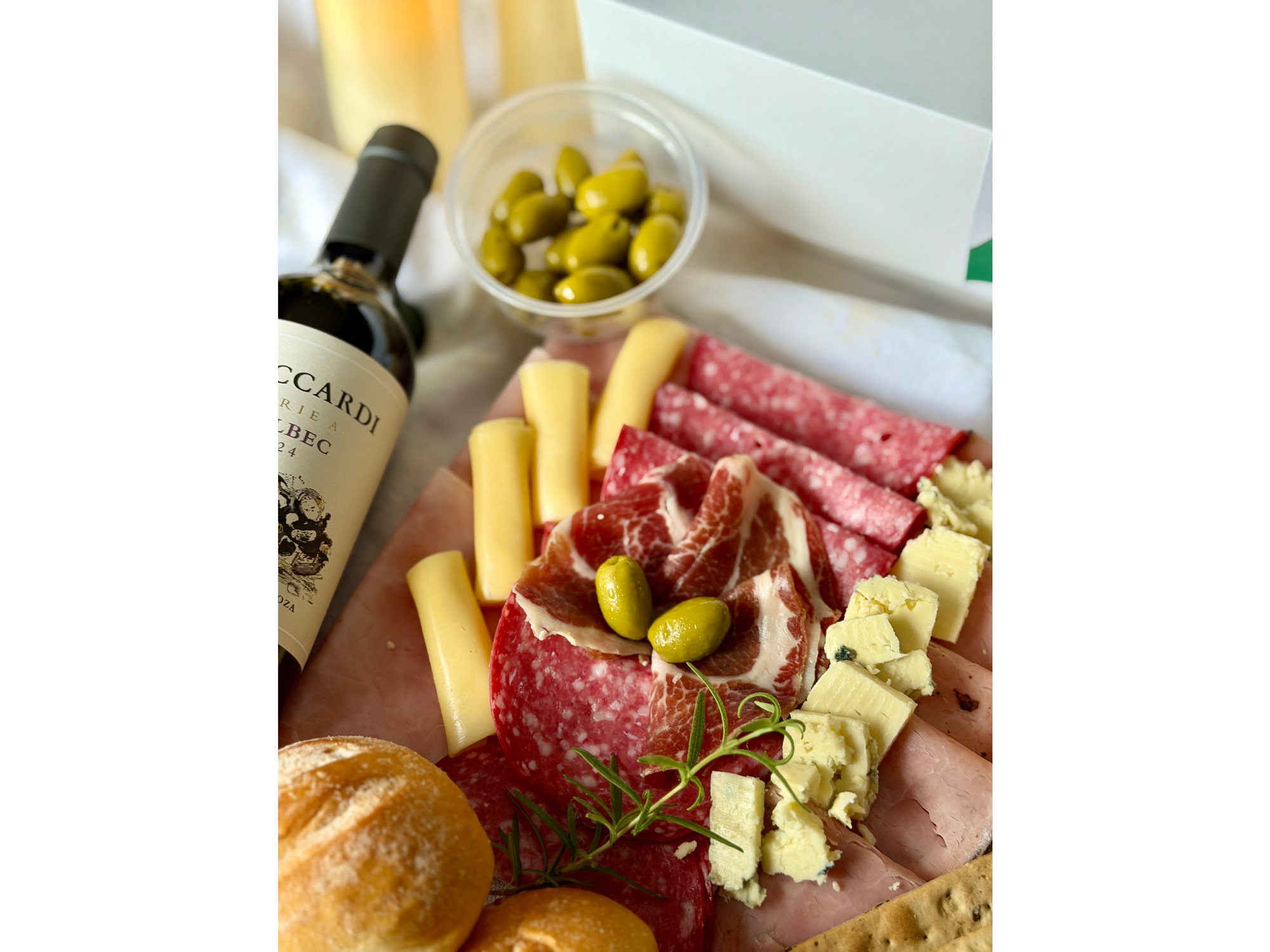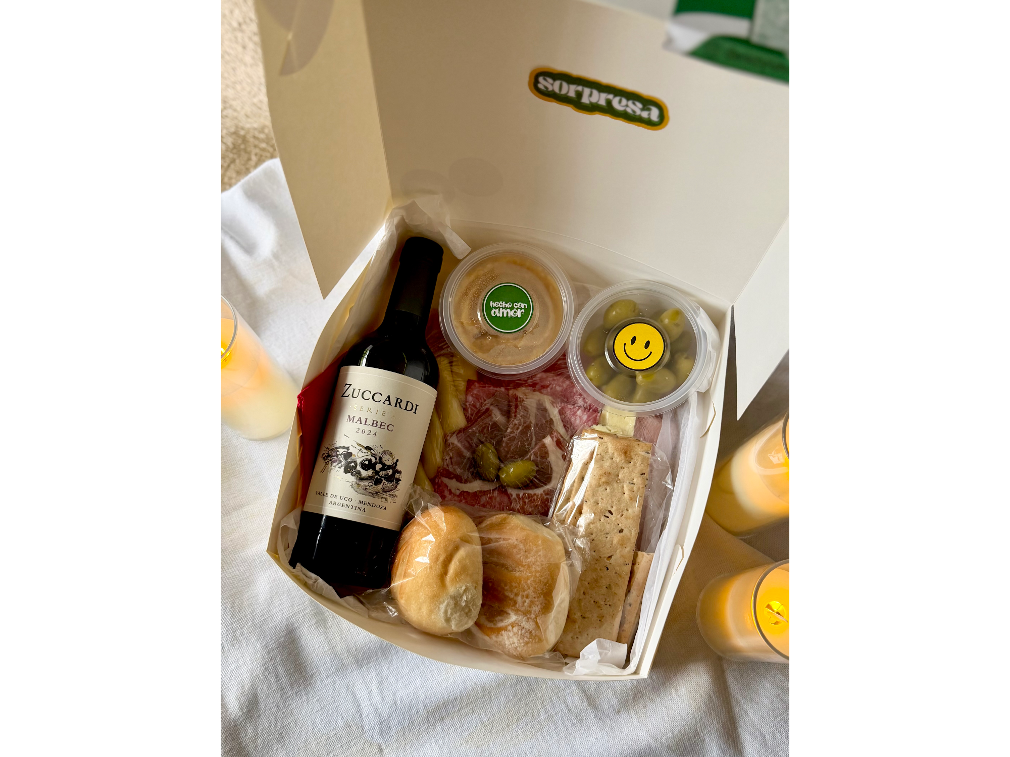 ¿Que incluye? • Botella de vino tinto malbec de 375cc (consultar stock disponible) • Tablita de fiambe • Aceitunas • Hummus • Pancitos x2 • Chalitas multicereal