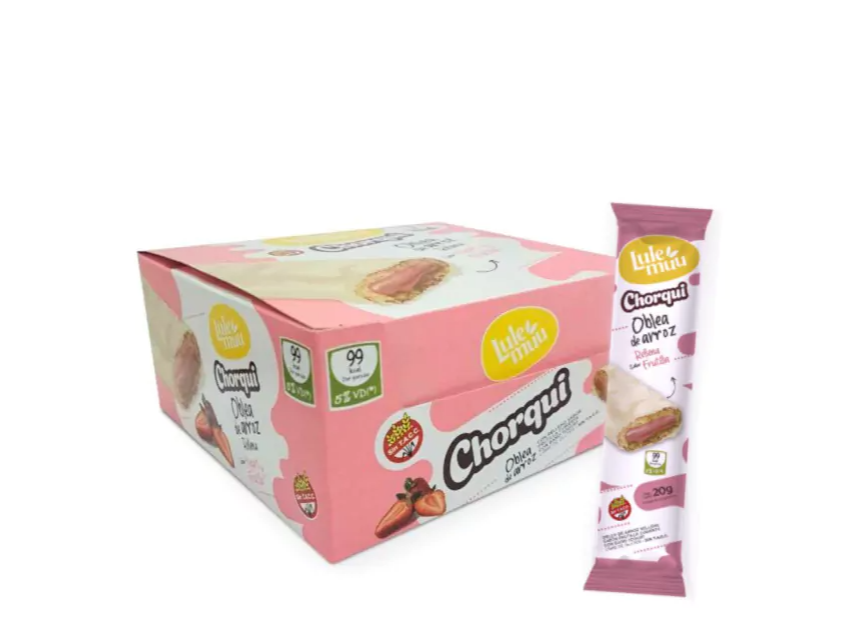 Lulemuu ChorquiBarra de harina de arroz, rellenena de crema de frutilla o mani Presentaciones Seleccioná una opción.Caja Exhibidora x 20 unidades ($603,49 Precio por unidad) $12.069,736 Caja Exhibidora x 20 unidades $10973.33 c/u $65.840 Personalizá tu selección Las siguientes opciones aplican para cada producto agregado. Sabor (cada caja viene de un solo sabor) Seleccioná las opciones que quieras.Chocolate Negro, Relleno de ManíChocolate Blanco, Relleno de Frutilla Observaciones 0 / 150