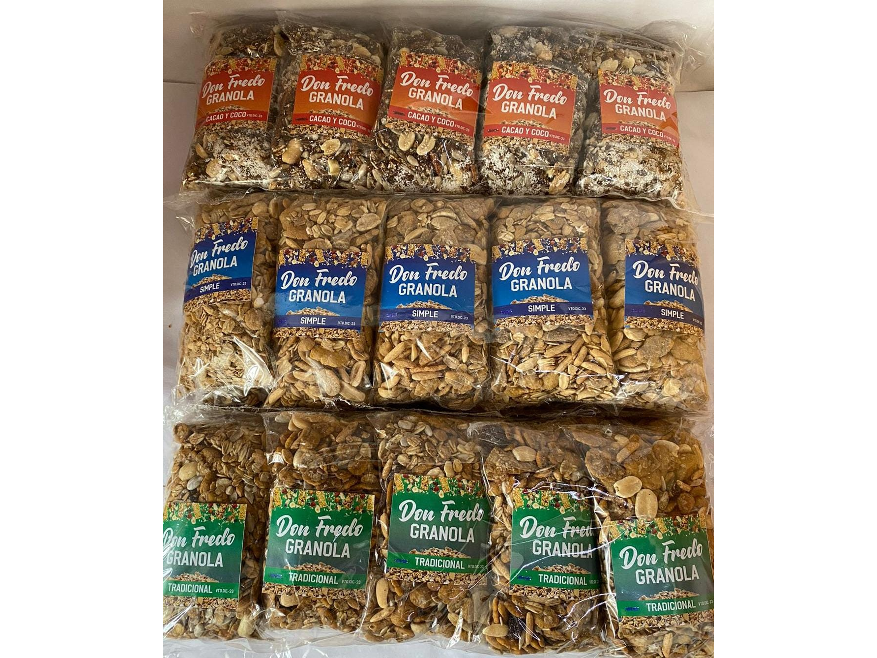 Granola DON FREDO Presentaciones Seleccioná una opción.Pack Surtido 10 x 80grs$9.482,403 Pack Sabor 10 x 80grs $9030(c/u) $27.090 Personalizá tu selección Las siguientes opciones aplican para cada producto agregado. Sabor Seleccioná las opciones que quieras.Con CacaoTradicionalTropicalSimple Observaciones 0 / 150