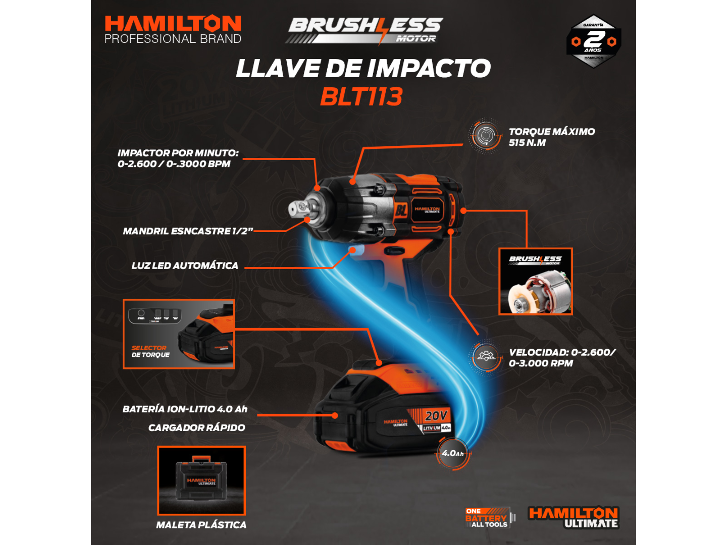 • Selector de 3 Modos: Torque Bajo, Torque Alto, y AutoStop Reversa.
