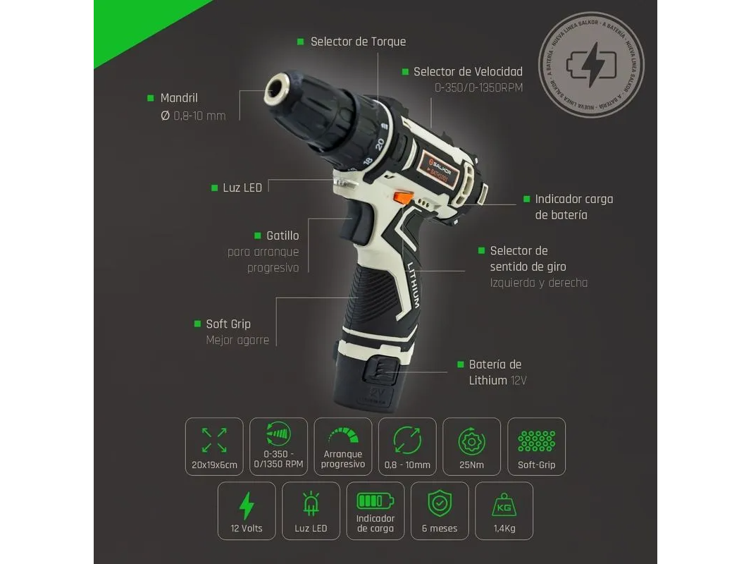 BATH1001Taladro atornillador inalámbrico 12V - Salkor Compartir Modelo: BATH1001 Voltaje: 12 V Amperaje: 1,5 A Mandril: 0,8 a 10 mm Torque máximo: 25 Nm Velocidad: 1350 rpm Velocidad variable Función reversible Contiene luz led Incluye batería y cargador$45.590 Observaciones 0 / 150