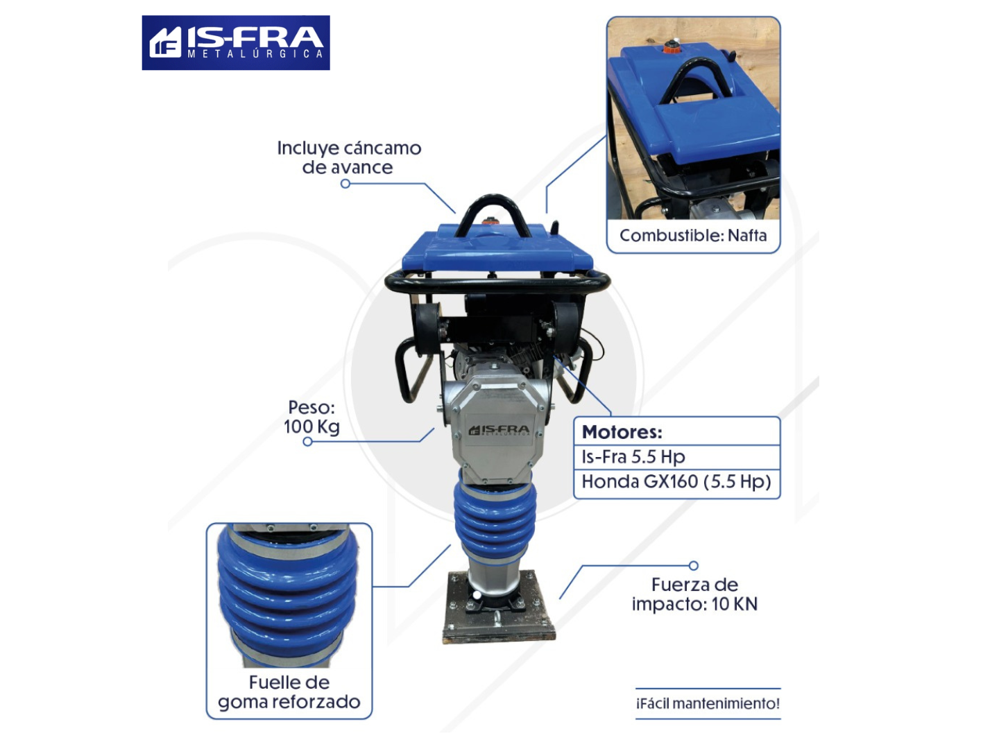 IMP01Motopison motor 5.5 HP, Is- fra Compartir por WhatsApp Copiar enlace IMP01 Incluye cáncamo de avance Velocidad de avance: 10 a 13 m/min Motores compatibles: Is-Fra 5.5 HP Honda GX160 5.5 HP Fuerza de impacto: 10 kN Combustible nafta Fuelle de goma reforzado Peso 100 kg$1.326.690 Observaciones 0 / 150