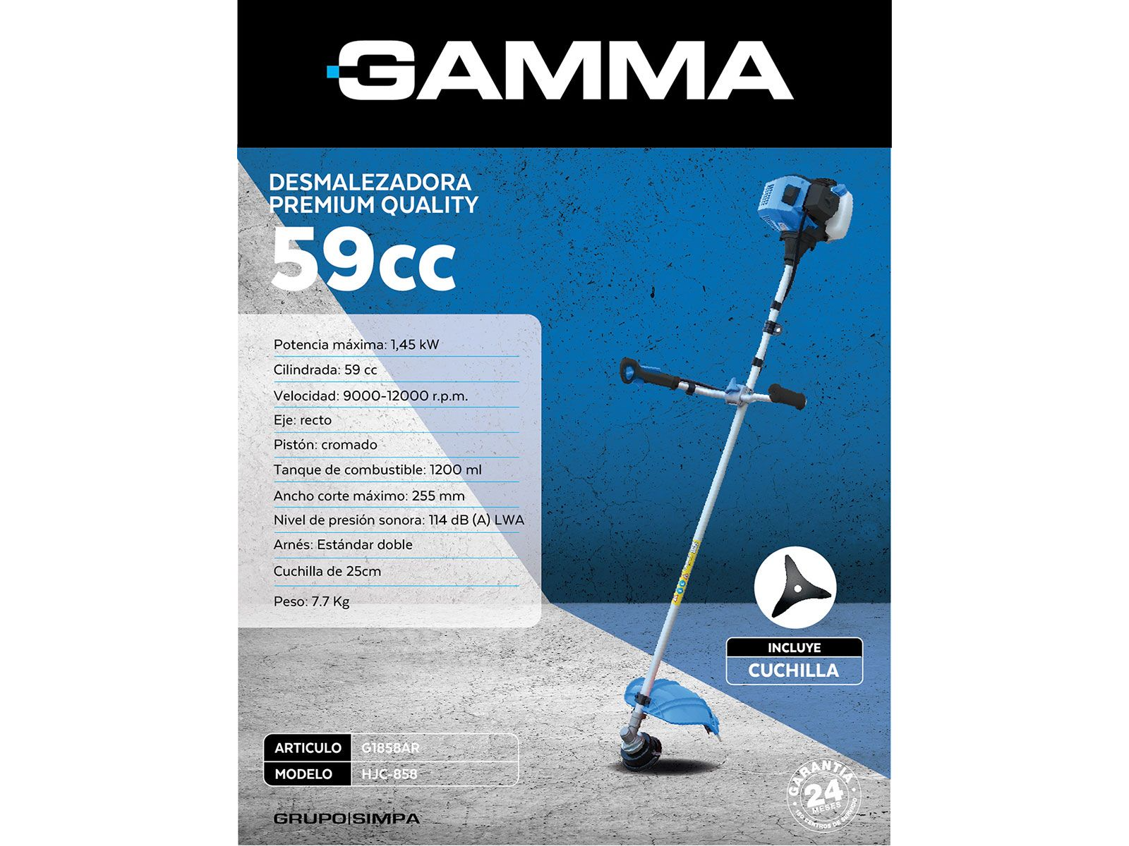 G1858ARDesmalezadora motoguadaña 59 cc - Gamma Compartir Modelo: G1858AR Cilindrada: 59 cc Potencia: 2 HP Velocidad: 9.000 a 12.000 rpm Pistón cromado Tanque de combustible: 1,2 litros Ancho máximo de corte: 255 mm Nivel de presión sonora: 114 dB Arnés doble Cuchilla de 25 cm$202.300 Observaciones 0 / 150