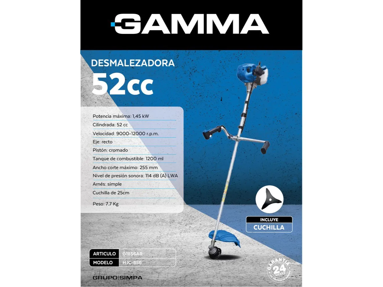 G1856ARDesmalezadora motoguadaña 52 cc - Gamma Compartir Modelo: G1856AR Potencia: 1,45 kW Cilindrada: 52 cc Velocidad: 9000 - 12000 rpm Tanque de combustible: 1200 ml Ancho corte máximo: 255 mm Nivel de presión sonora: 114 dB Cuchilla: 25 cm Arnés: simple$152.550 Observaciones 0 / 150