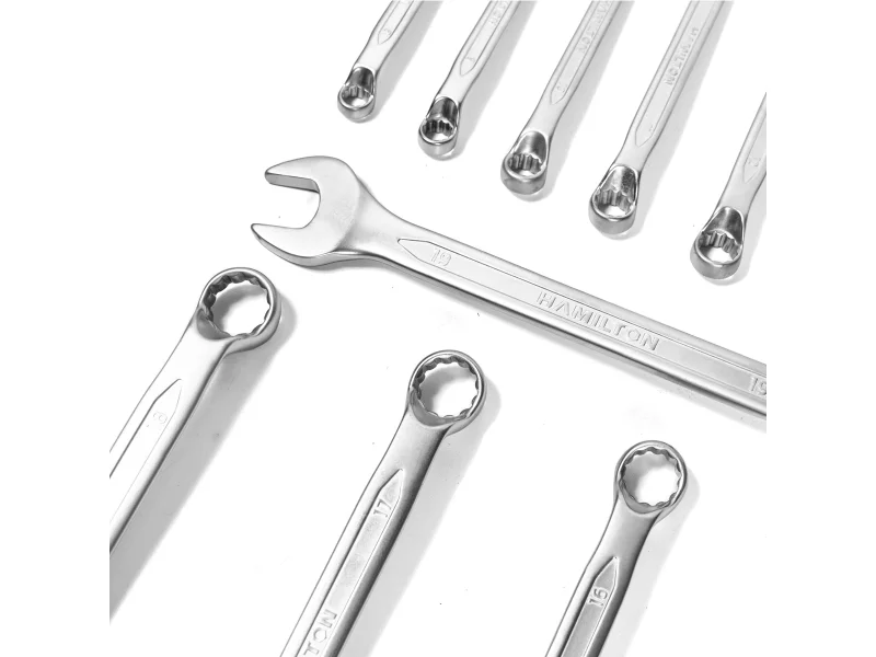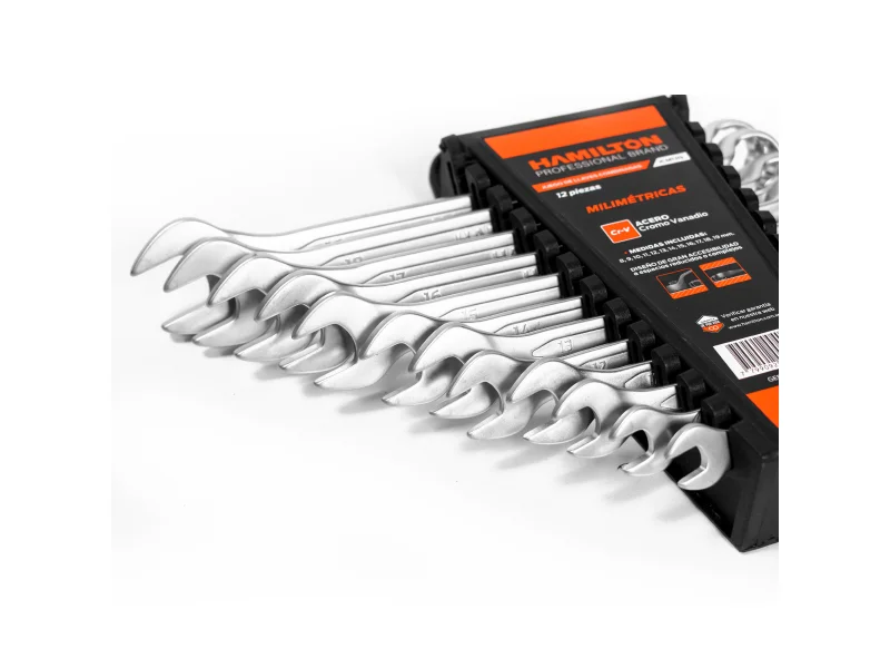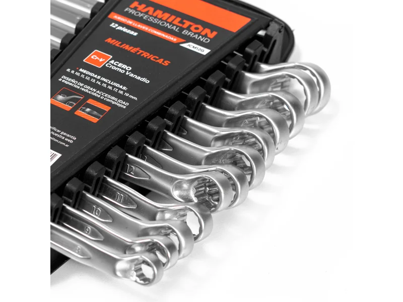 JCM12GJuego de 12 llaves combinadas 8 a 19 mm - Hamilton Compartir SKU: JCM12G 12 Unidades Juego de 12 Llaves Combinadas en milímetros: – Medidas: 8, 9, 10, 11, 12, 13, 14, 15, 16, 17, 18 y 19 mm. – Forjadas en Acero Cromo Vanadio. – Tratamiento anticorrosión. – Diseño Acodado que permite mejorar su accesibilidad a espacios reducidos o complejos.$69.470 Observaciones 0 / 150