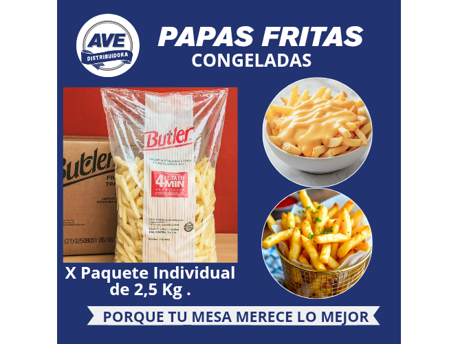 PAPAS FRITAS BUTLER - (En bolsa de 2,5 Kg). Compartir por WhatsApp Copiar enlace Ricas, prácticas y rendidoras. Un producto que llega y se vende sólo! Todos amamos a las papas!. Económicas y con ganancia asegurada, ideales para casas de comidas, carritos, rotiserías y emprendimientos gastronómicos.$7.499 Observaciones 0 / 150 Encontrá productos relacionados X UNIDAD (4)