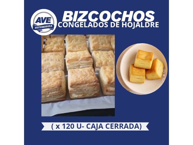 BIZCOCHOS DE HOJALDRE CONGELADOS - CAJA CERRADA ( x 120 Unidades)Estos Bizochos son una bomba! Son crocantes, riquísimos y prácticos. Ahorrá tu tiempo! Listos para llevar al horno y disfrutar!. (TRAEN 120 UNIDADES - CAJA CERRADA).$32.400 Observaciones 0 / 150 Encontrá productos relacionados BIZCOCHOS (1)