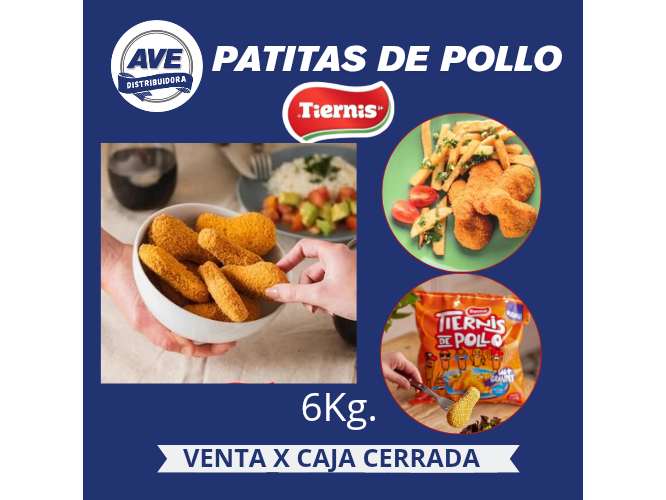 PATITAS DE POLLO - TIERNISPatitas Rebozadas para cambiar un poco tu menú diario, súper ricas y saludables. Déjate tentar y probalas que son exquisitas! Prácticas y listas para comer!. (Congelados)$32.400 Observaciones 0 / 150 Encontrá productos relacionados POLLO (3)